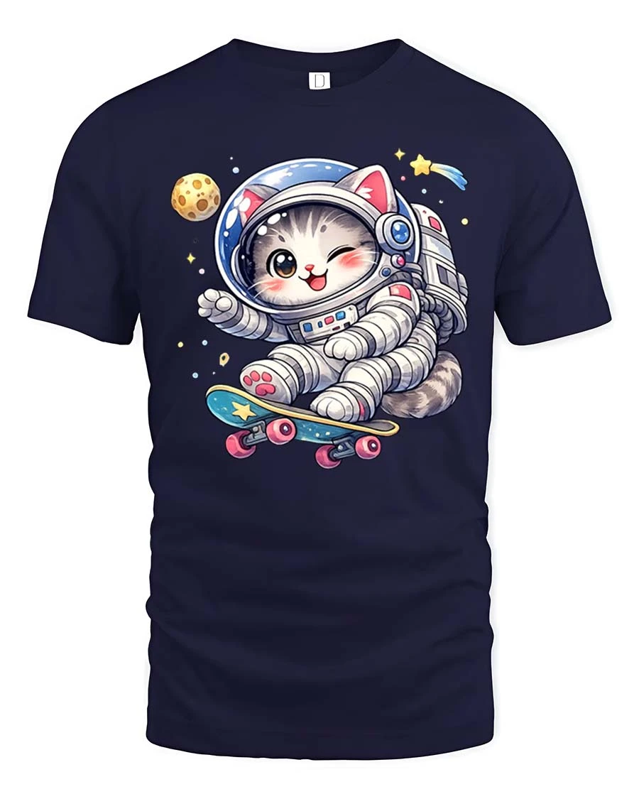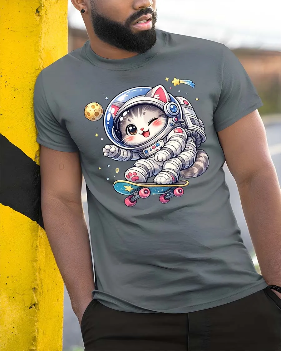 Perfect for cat lovers, space fans, and anyone who enjoys fun cartoon graphic tees, this shirt adds a cheerful and unique touch to any casual outfit.