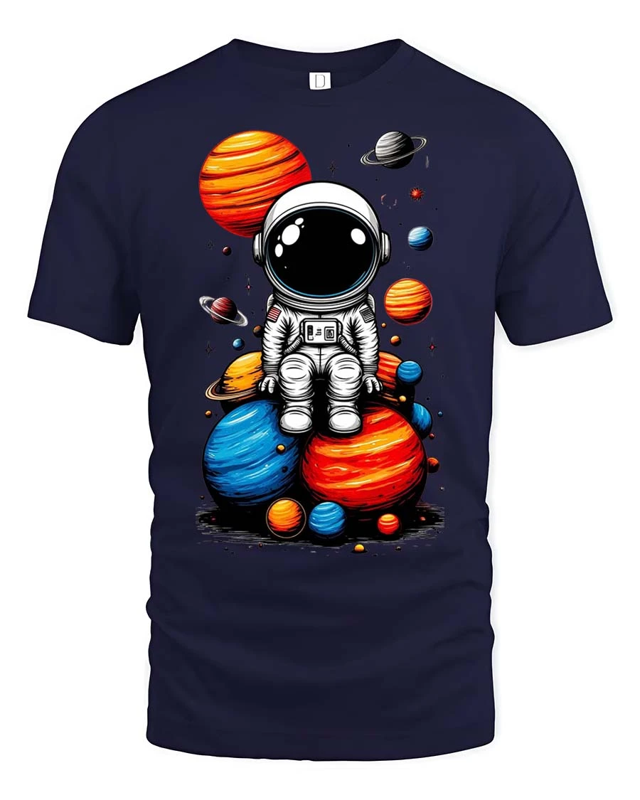 This cute astronaut sitting on planets t-shirt features a colorful cosmic design that captures the wonder of space exploration. The charming astronaut illustration surrounded by vibrant planets creates a playful galaxy scene that stands out on any outfit. It’s a perfect graphic tee for anyone who loves astronomy, the universe, and imaginative space-themed designs.