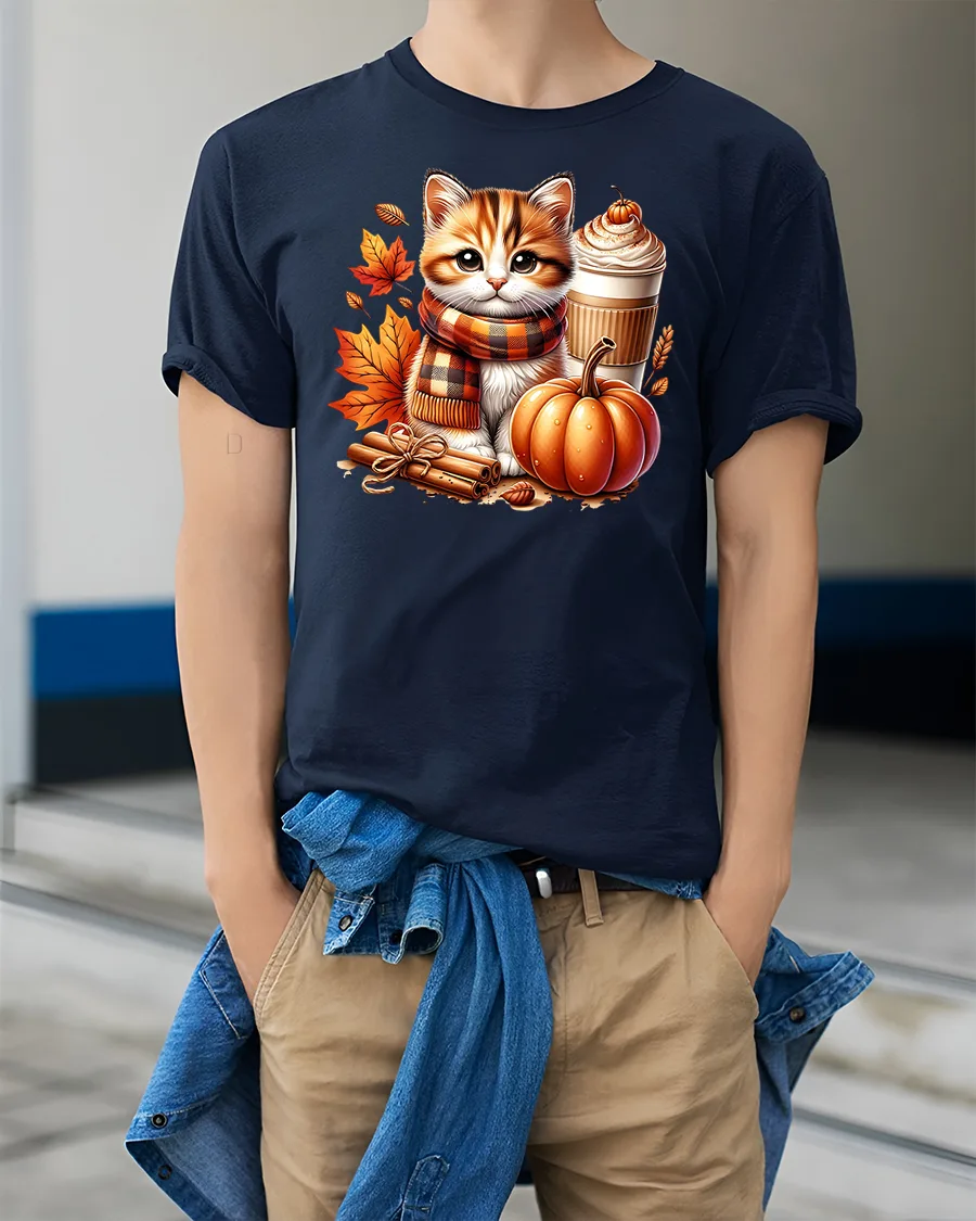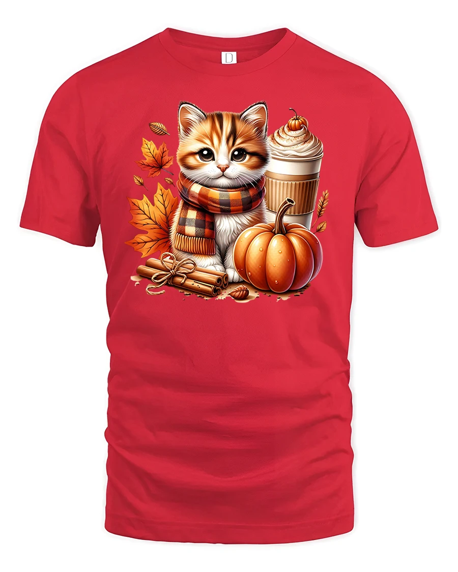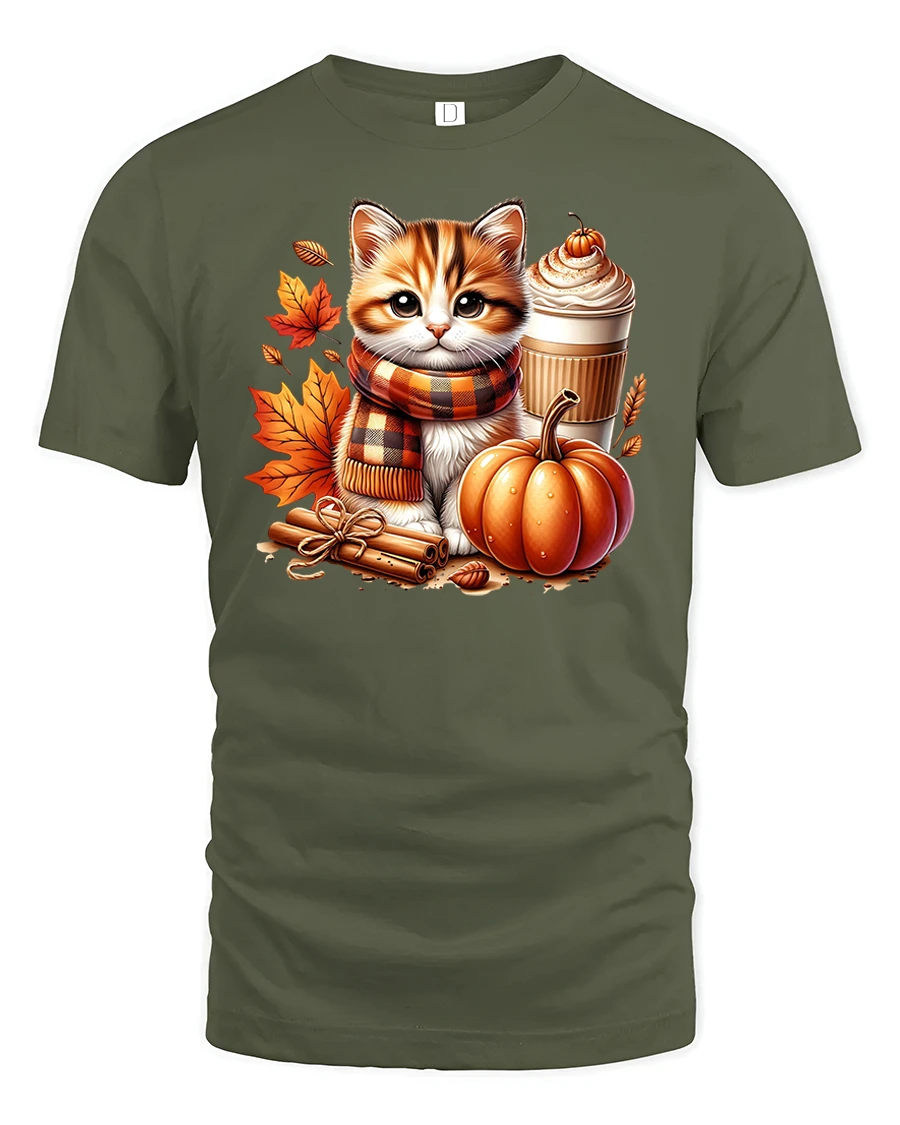 Cute Autumn Cat with Pumpkin Spice Graphic T-Shirt is the perfect seasonal design for cat lovers and fall enthusiasts. Featuring an adorable kitten wrapped in a cozy scarf, surrounded by pumpkins, cinnamon sticks, autumn leaves, and a pumpkin spice latte, this tee captures everything we love about the cozy fall season. The detailed artwork brings warmth and charm, making it a must-have for your autumn wardrobe.