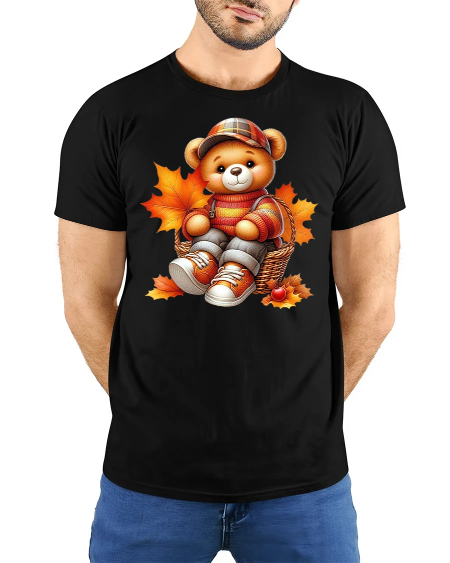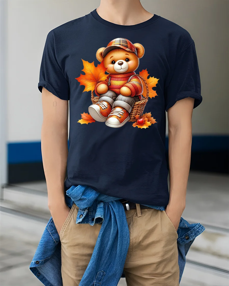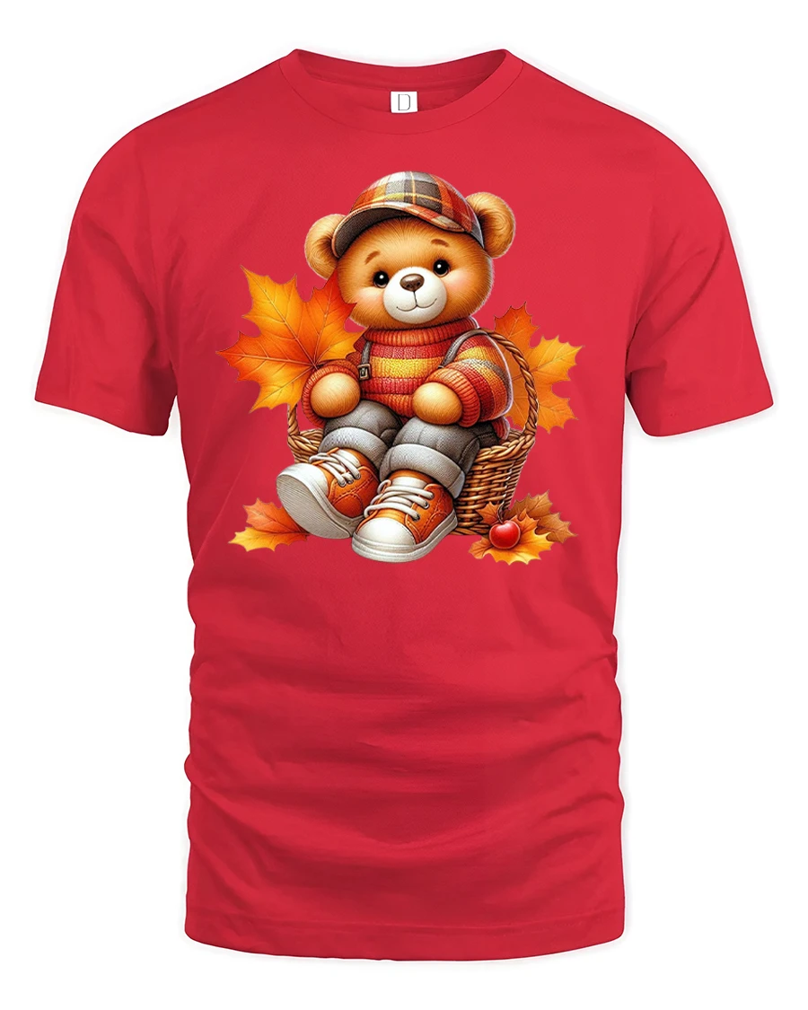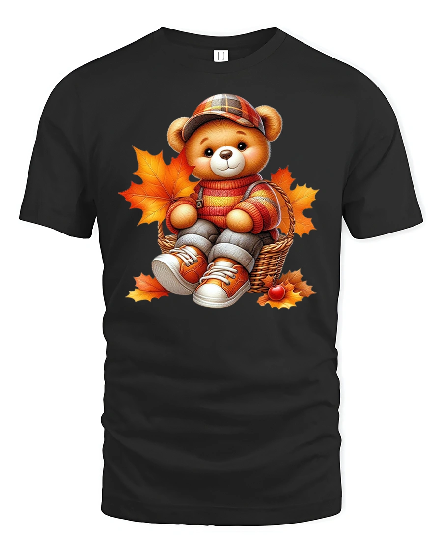 Featuring a smiling teddy bear in cozy plaid clothes, sitting among autumn leaves, this tee brings warmth, charm, and happiness to your outfit.