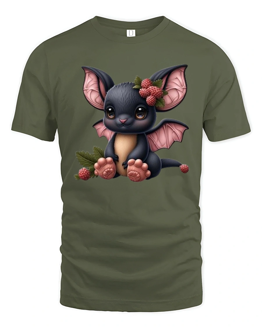 Cute Baby Bat With Berries Adorable Cartoon Illustration Tee - military green t-shirt on white background