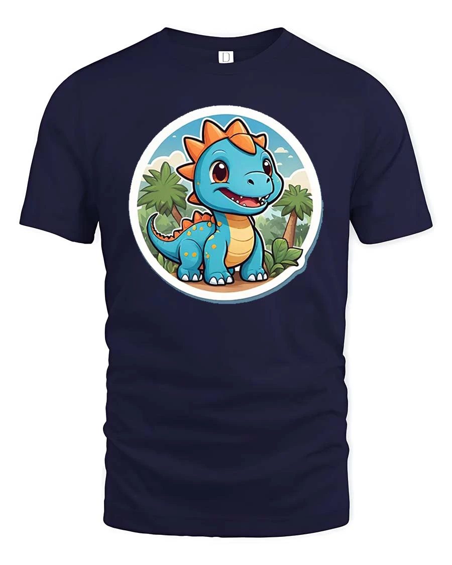 This cute baby dinosaur t-shirt features an adorable cartoon dinosaur standing in a colorful jungle setting surrounded by palm trees. The cheerful dino character with bright colors and friendly expression creates a playful design that instantly stands out. It’s a perfect graphic tee for dinosaur lovers and anyone who enjoys cute prehistoric-themed artwork.