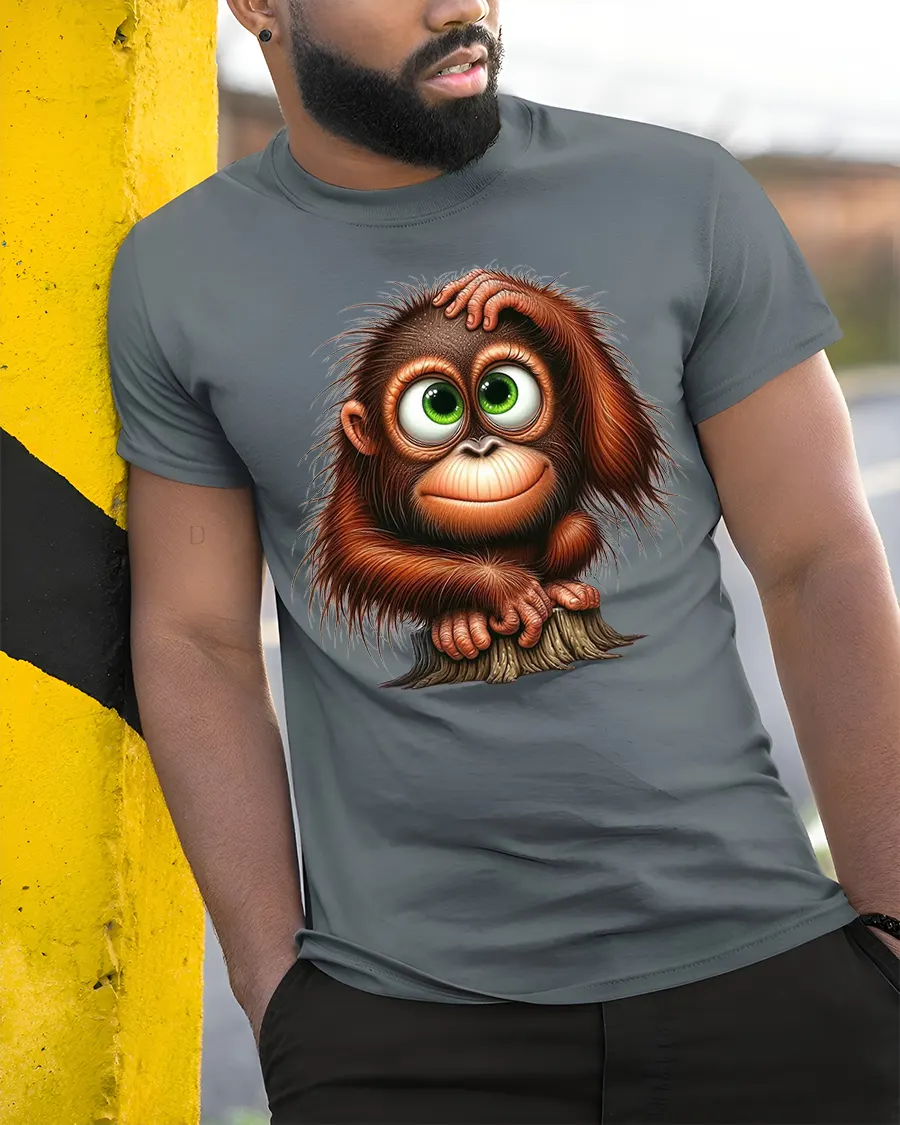 Cute Baby Monkey Graphic T Shirt Big Eyes Cartoon Style Art - model wearing grey tee, leaning on column