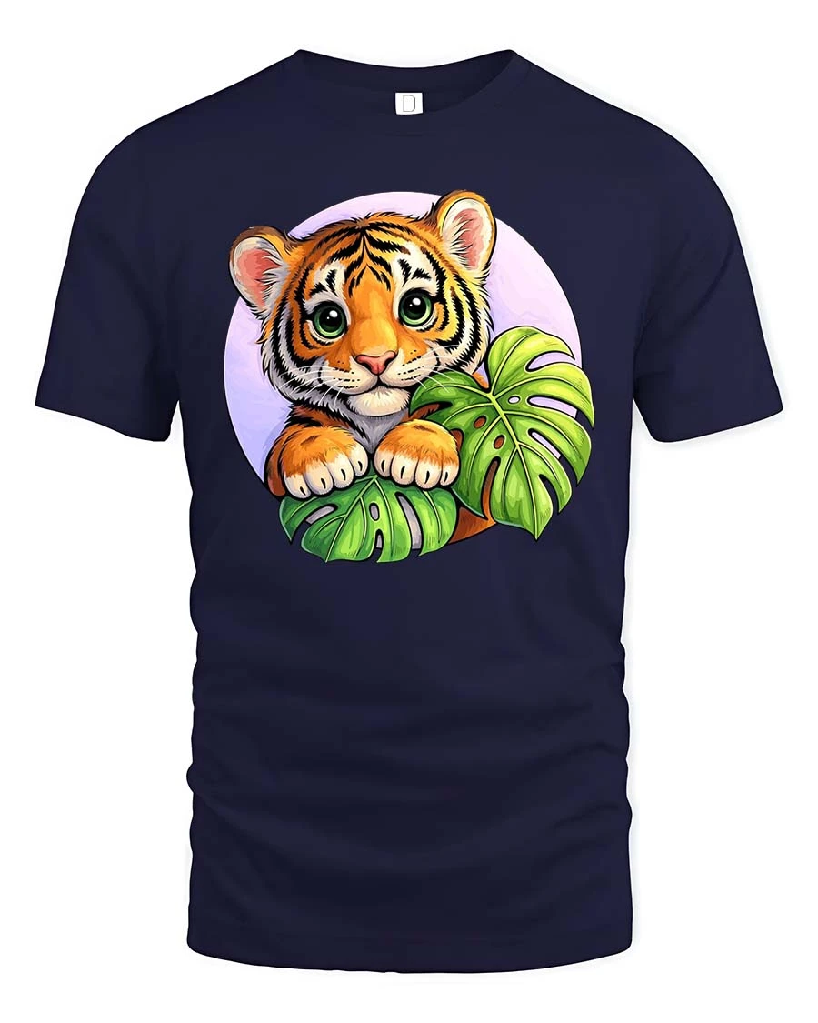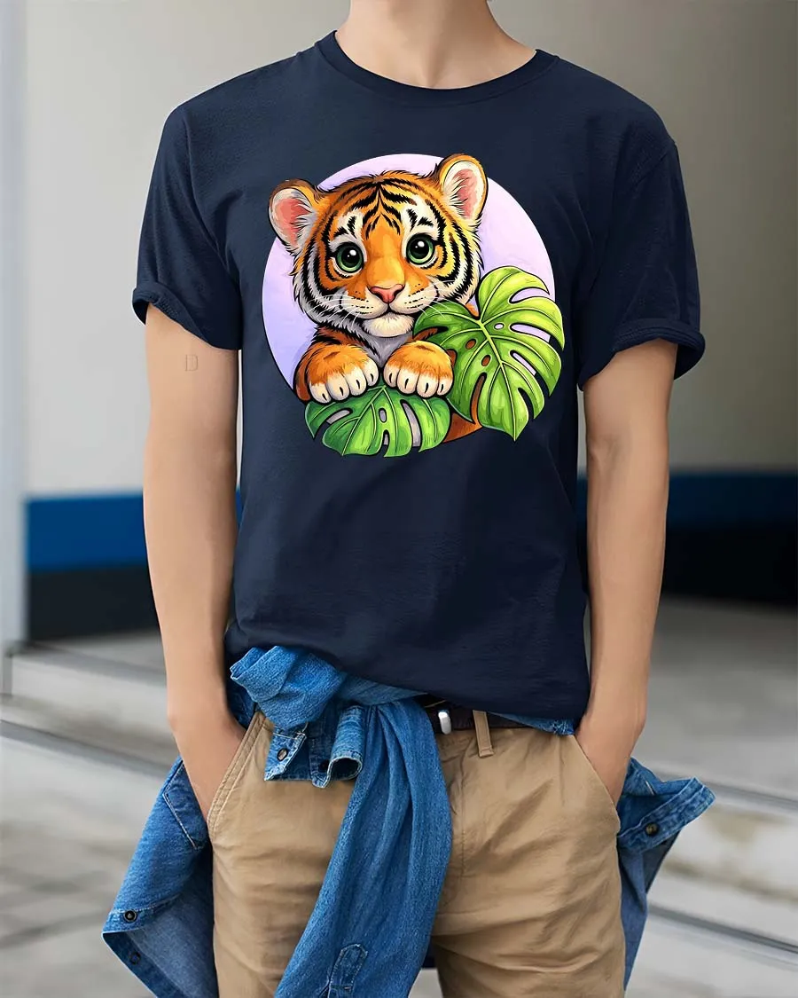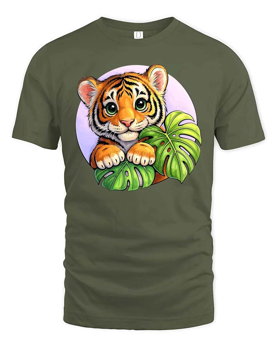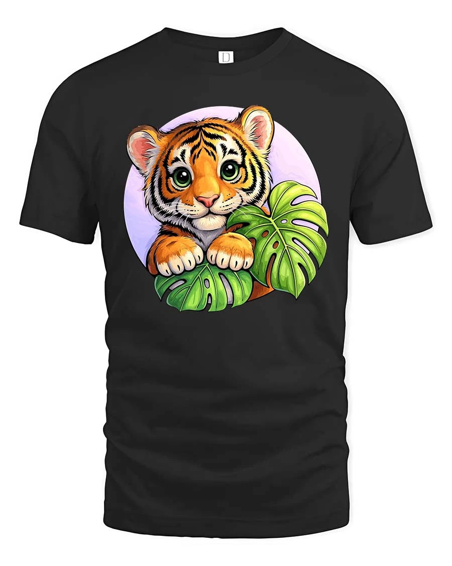 Cute Baby Tiger Jungle Leaves Cartoon Style t-shirt Soft combines comfort with delightful artistic expression.