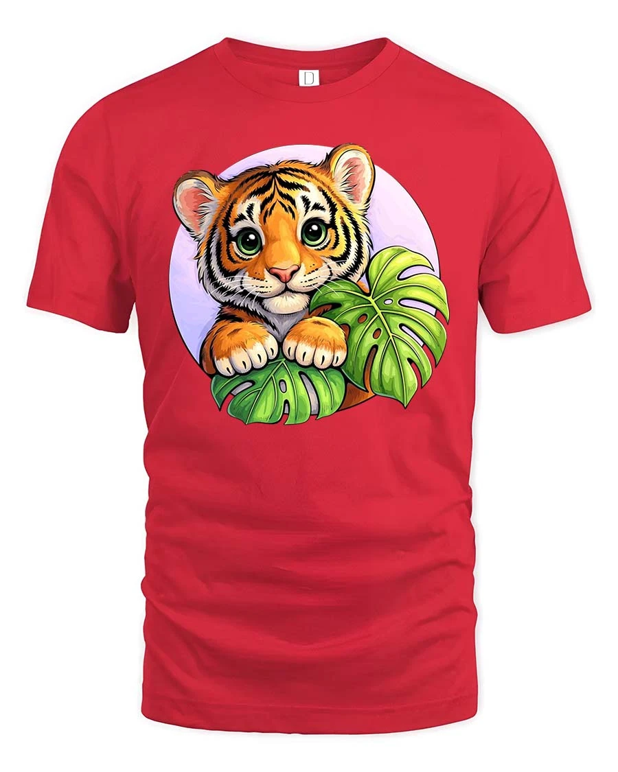 Cute Baby Tiger Jungle Leaves Cartoon Style t-shirt Soft - red t-shirt on white background