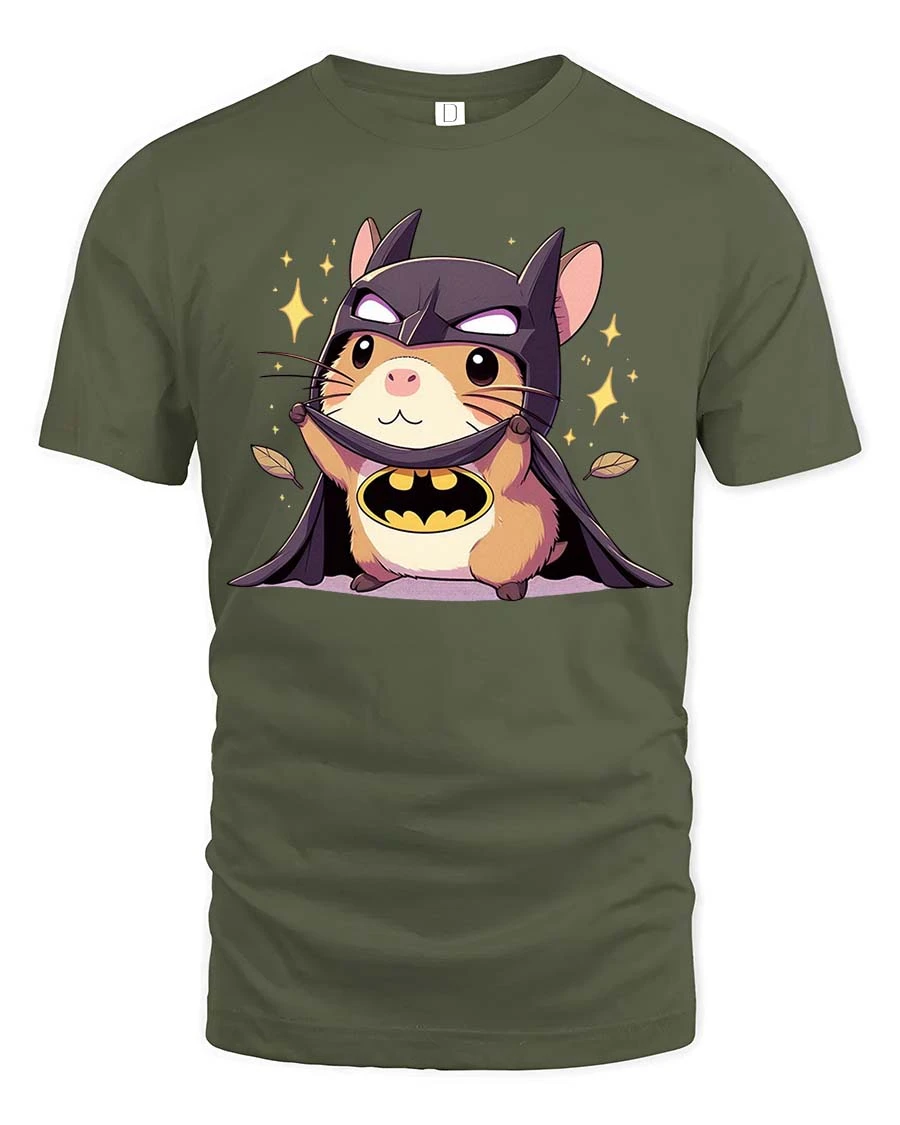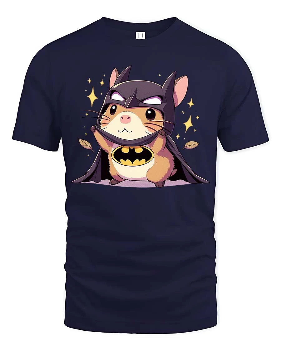 Featuring a cute hamster dressed as a bat-style hero, this graphic blends charm, humor, and creativity into one eye-catching look.