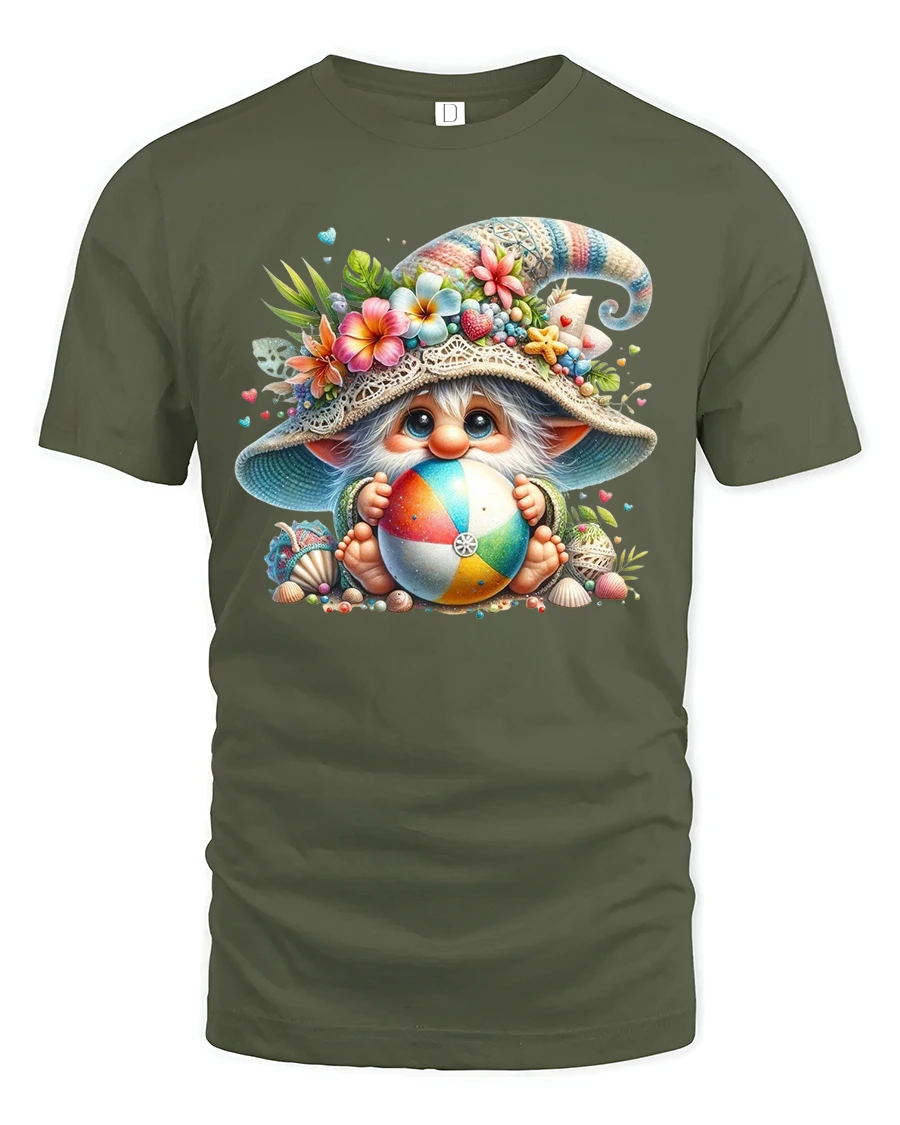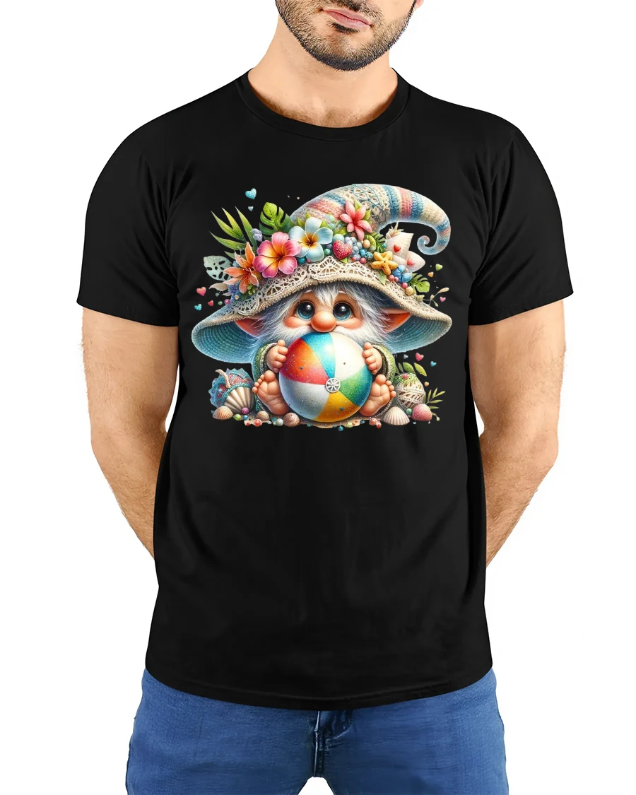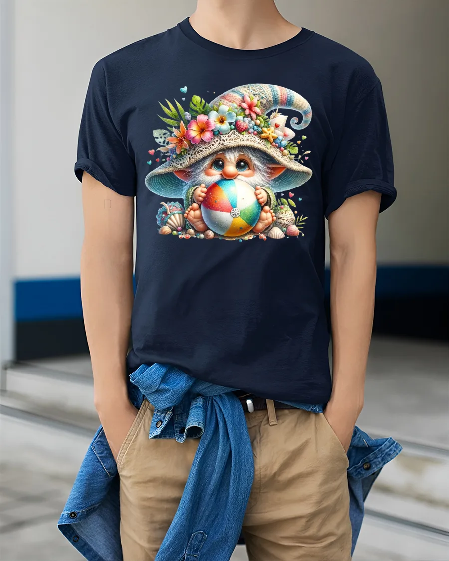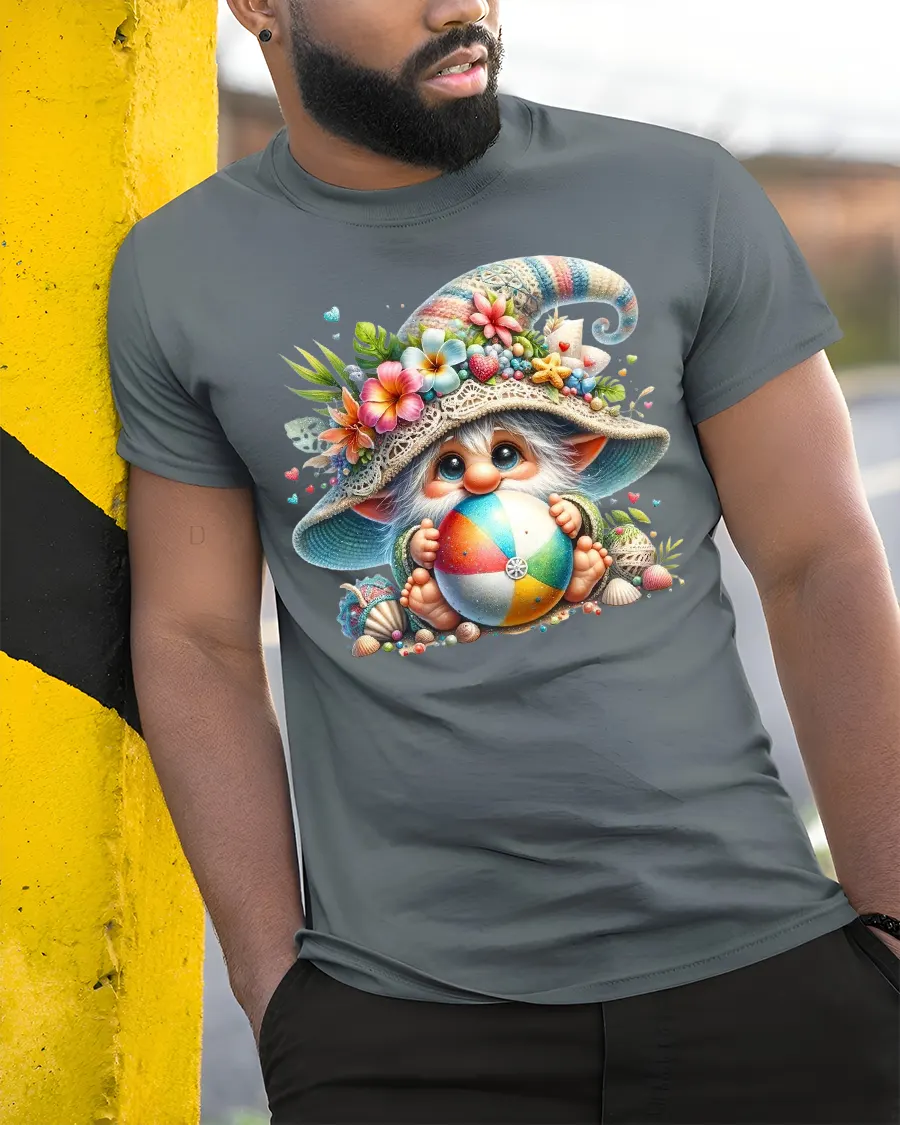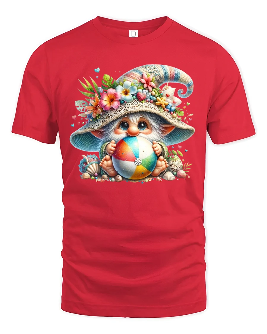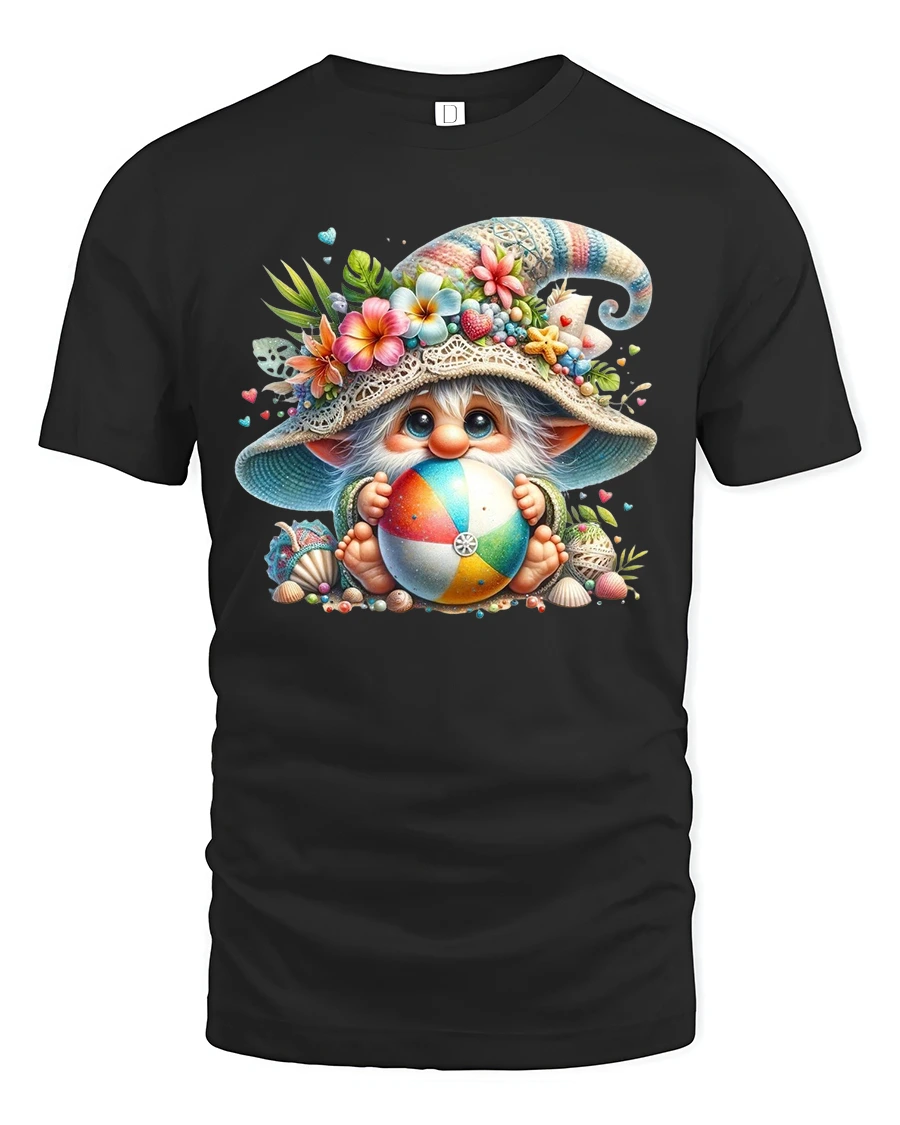 Cute Beach Gnome Holding Colorful Ball Summer Graphic Tee Tshirt brings joyful summer energy and whimsical charm into a bright and playful design.