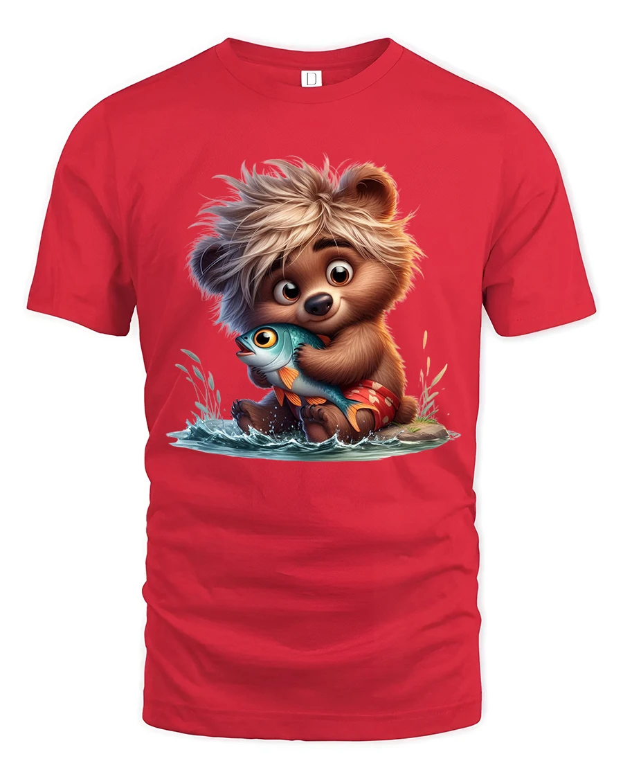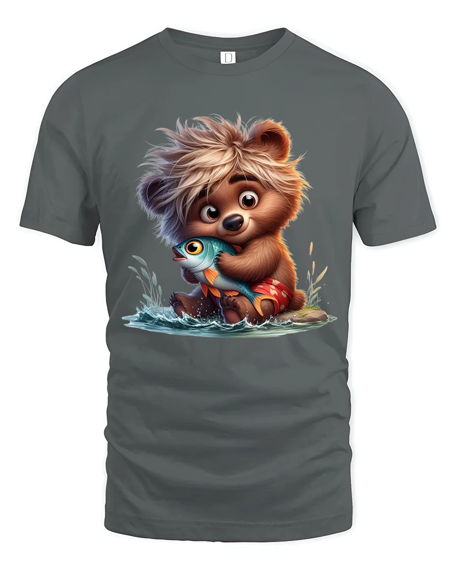 Tags: adorable bear shirt, animal graphic tee, bear art t shirt, bear cartoon shirt, bear fish tshirt, bear illustration tshirt, cartoon bear tee, cute animal t shirt, cute bear t shirt, cute character tshirt, cute wildlife tshirt, fishing bear shirt, fun animal tee, nature animal t shirt, playful animal shirt