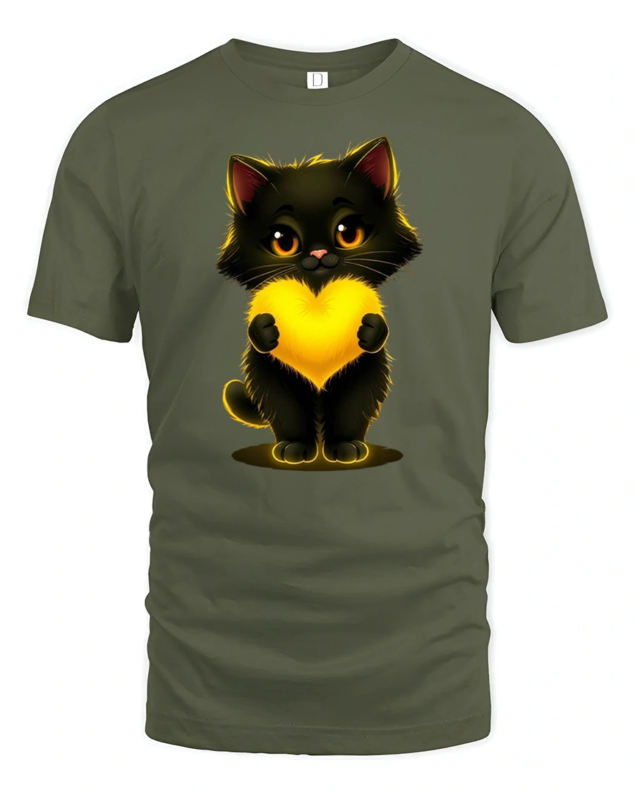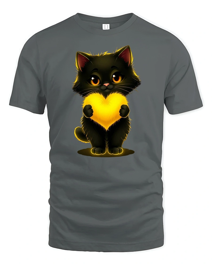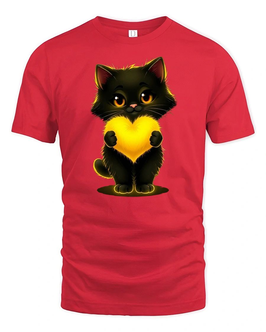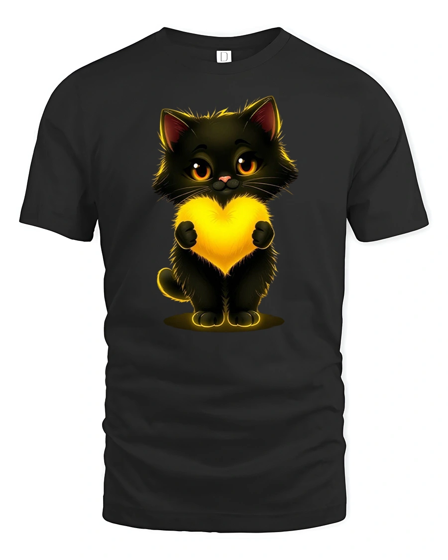 Cute Black Cat Holding Glowing Heart Art Graphic Tshirt brings warmth charm and sweetness into everyday style.