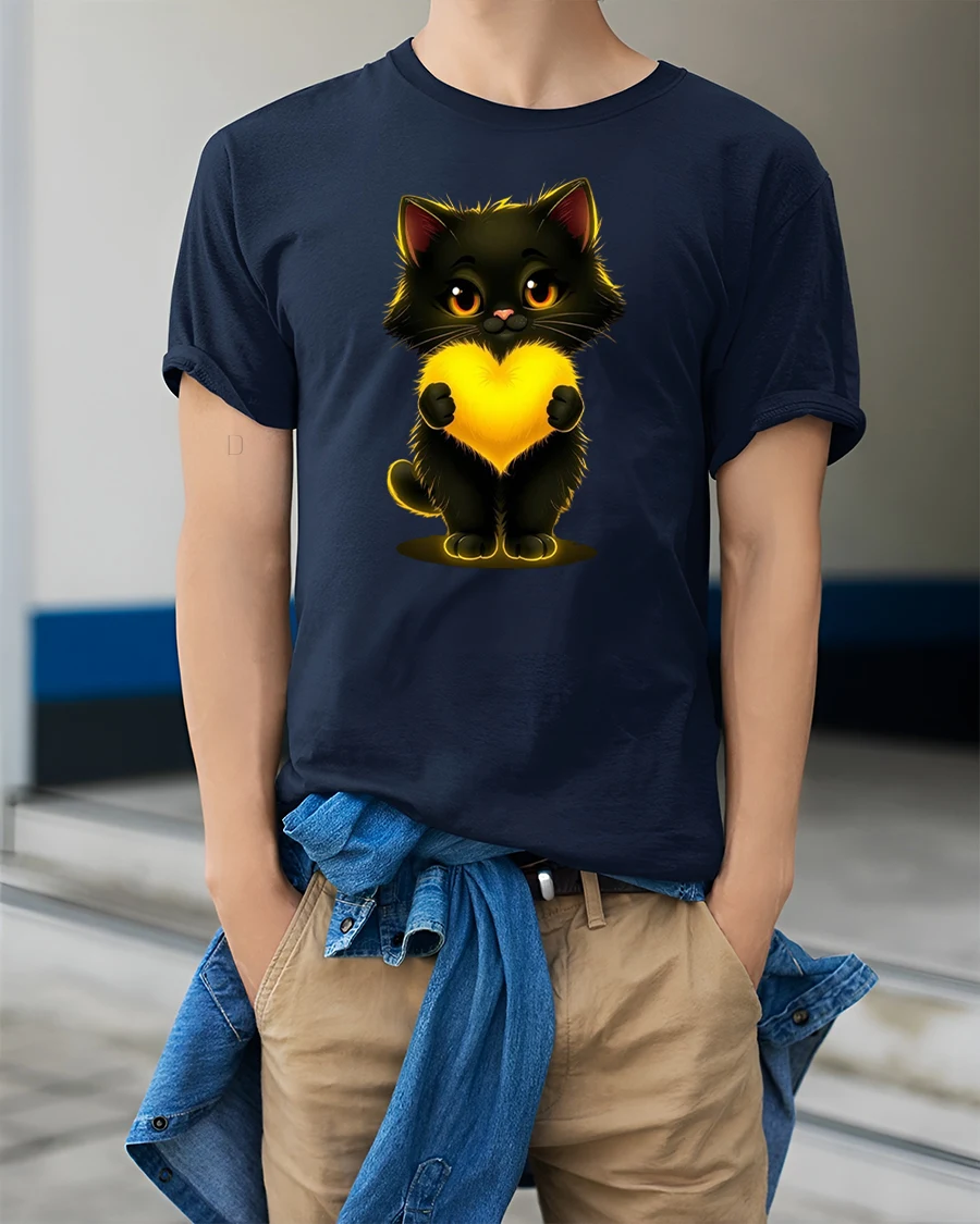Cute Black Cat Holding Glowing Heart Art Graphic Tshirt combines heartwarming illustration with modern casual fashion.