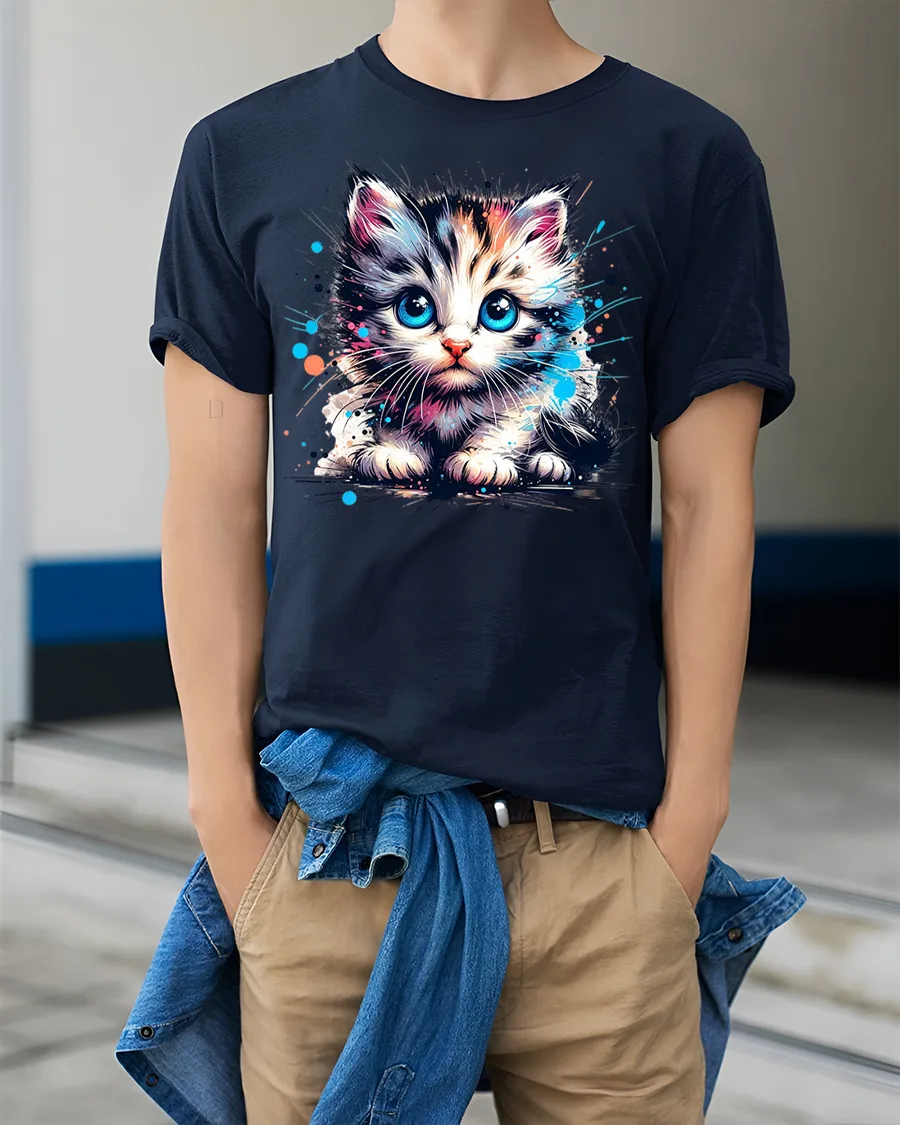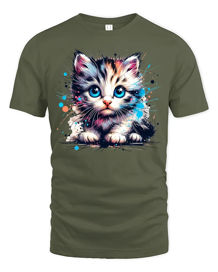 Add irresistible charm to your wardrobe with the Cute Blue Eyed Kitten Graphic T Shirt Art. This heart melting design features a wide eyed kitten with stunning blue eyes surrounded by vibrant paint splash accents. The artistic blend of soft fur detail and colorful splatter style makes this kitten t shirt a delightful statement piece that instantly brightens your look.