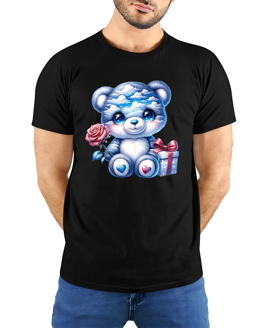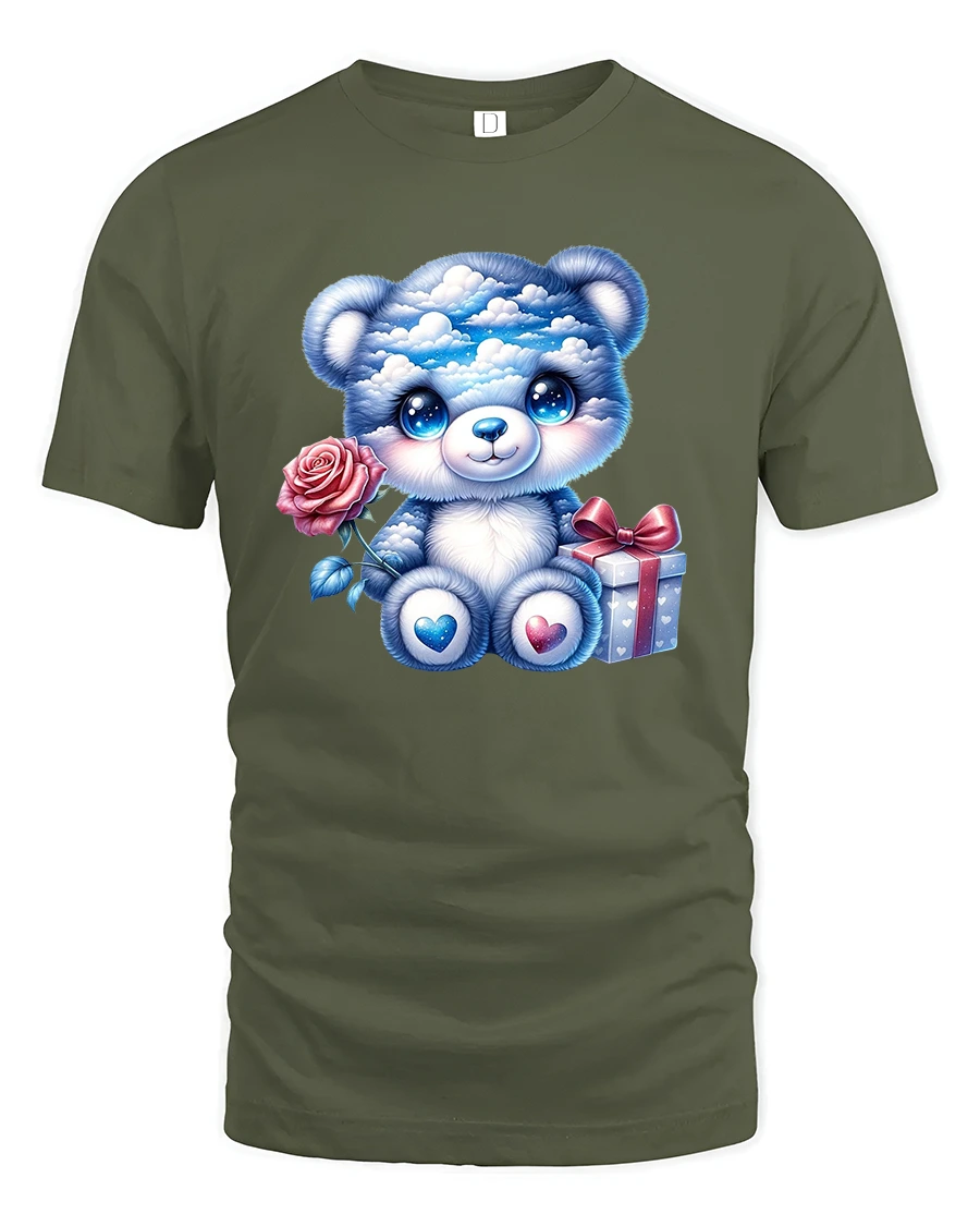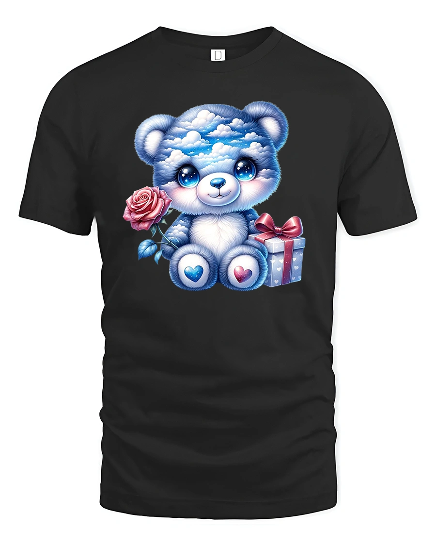 This teddy bear graphic tee features a soft blue bear with sparkling eyes holding a rose and a gift box that feels full of love and kindness.