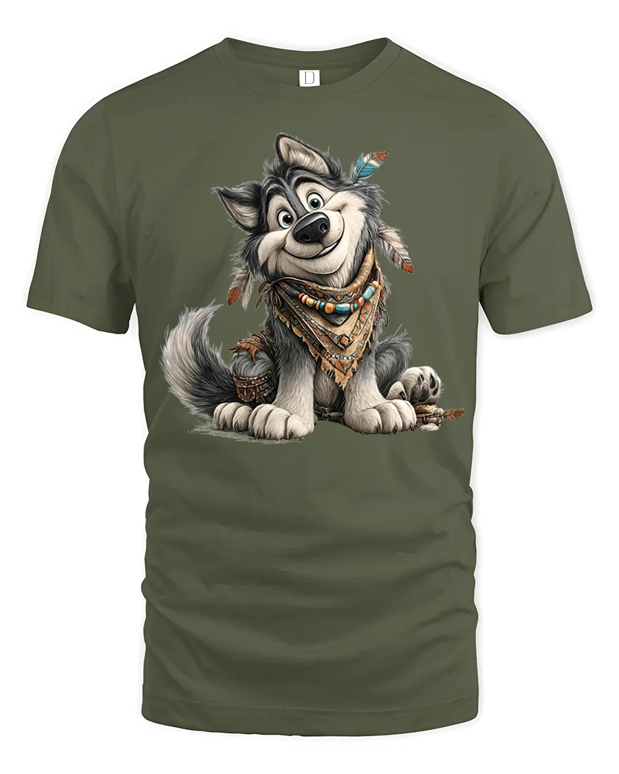 Cute Boho Wolf Cartoon Art T Shirt With Free Spirit Charm - military green t-shirt on white background
