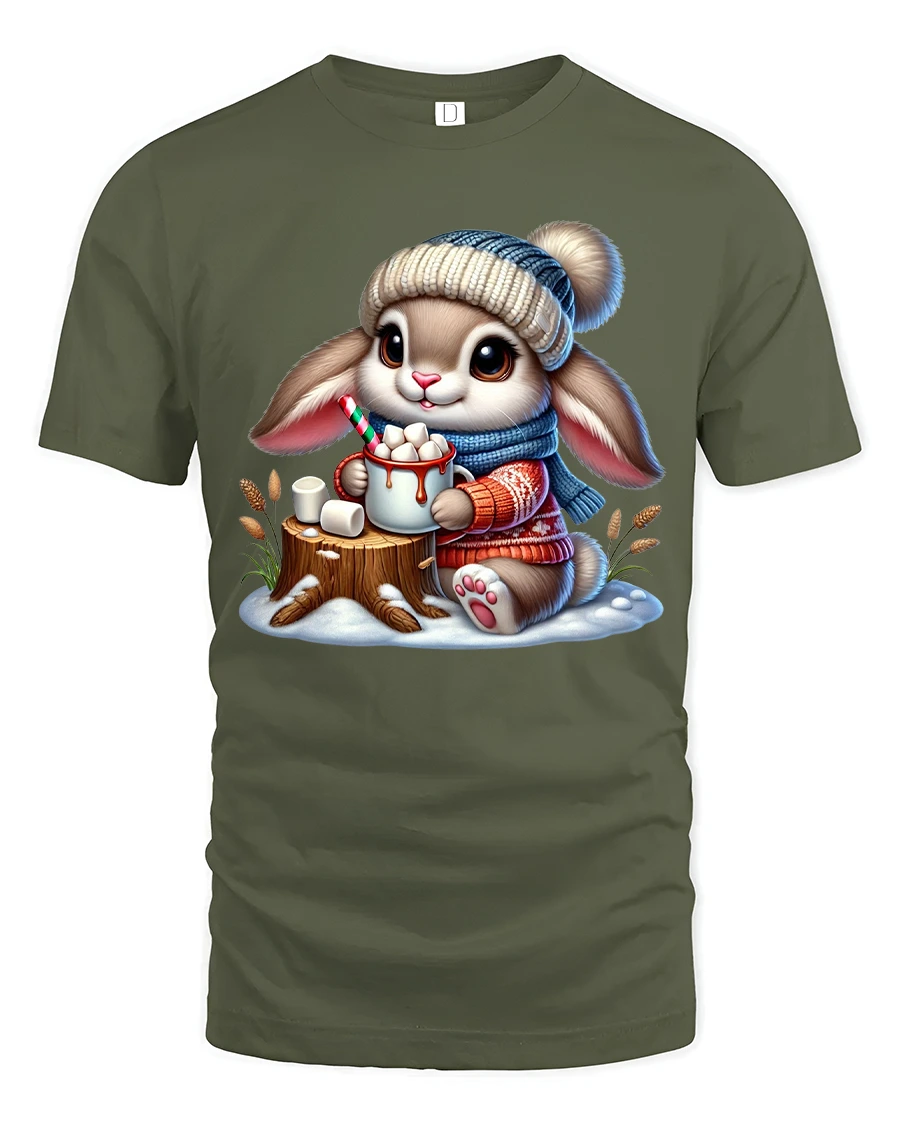 Cute Bunny Hot Cocoa Winter Cartoon Art TShirt Cozy Graphic Tee - military green t-shirt on white background