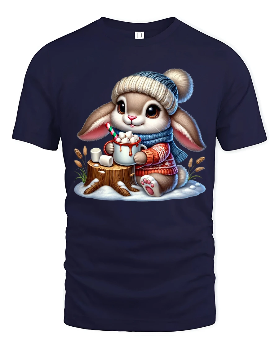 Cute Bunny Hot Cocoa Winter Cartoon Art TShirt Cozy Graphic Tee - navy t-shirt on white background