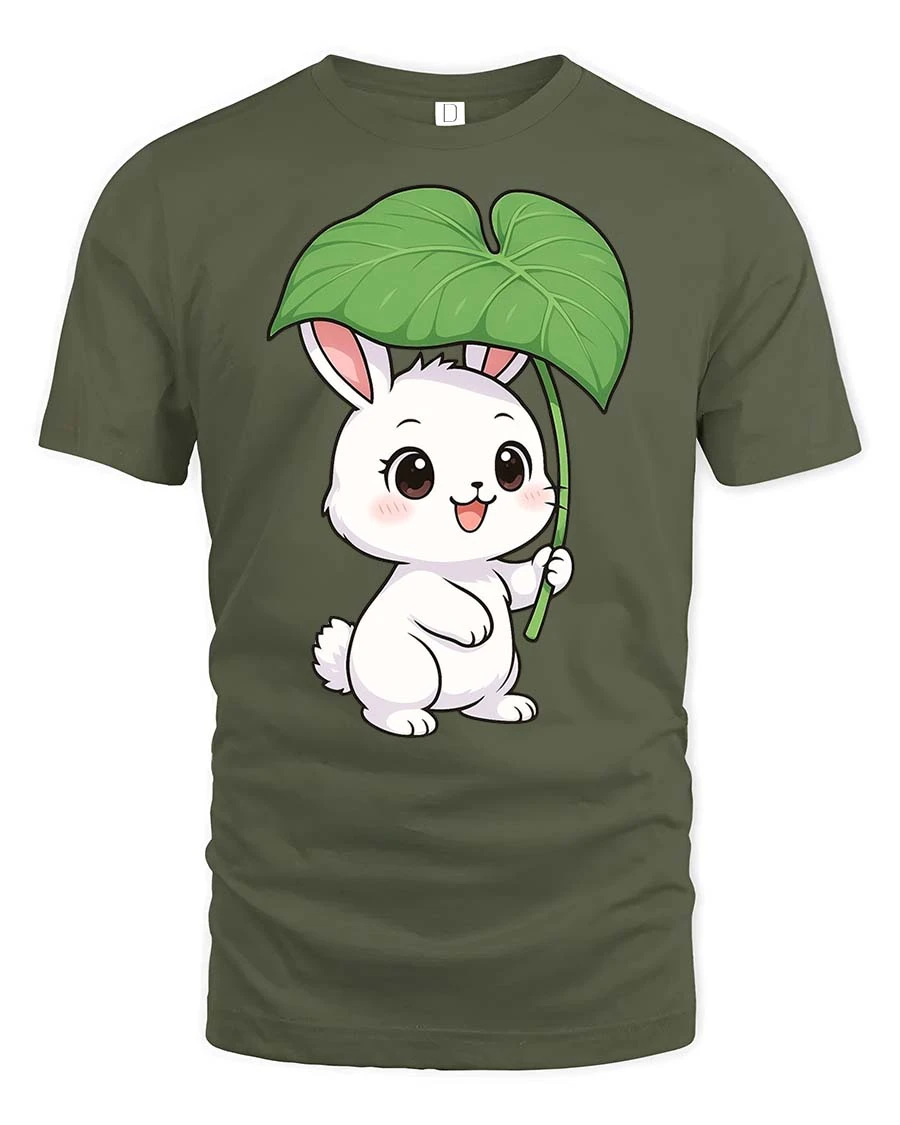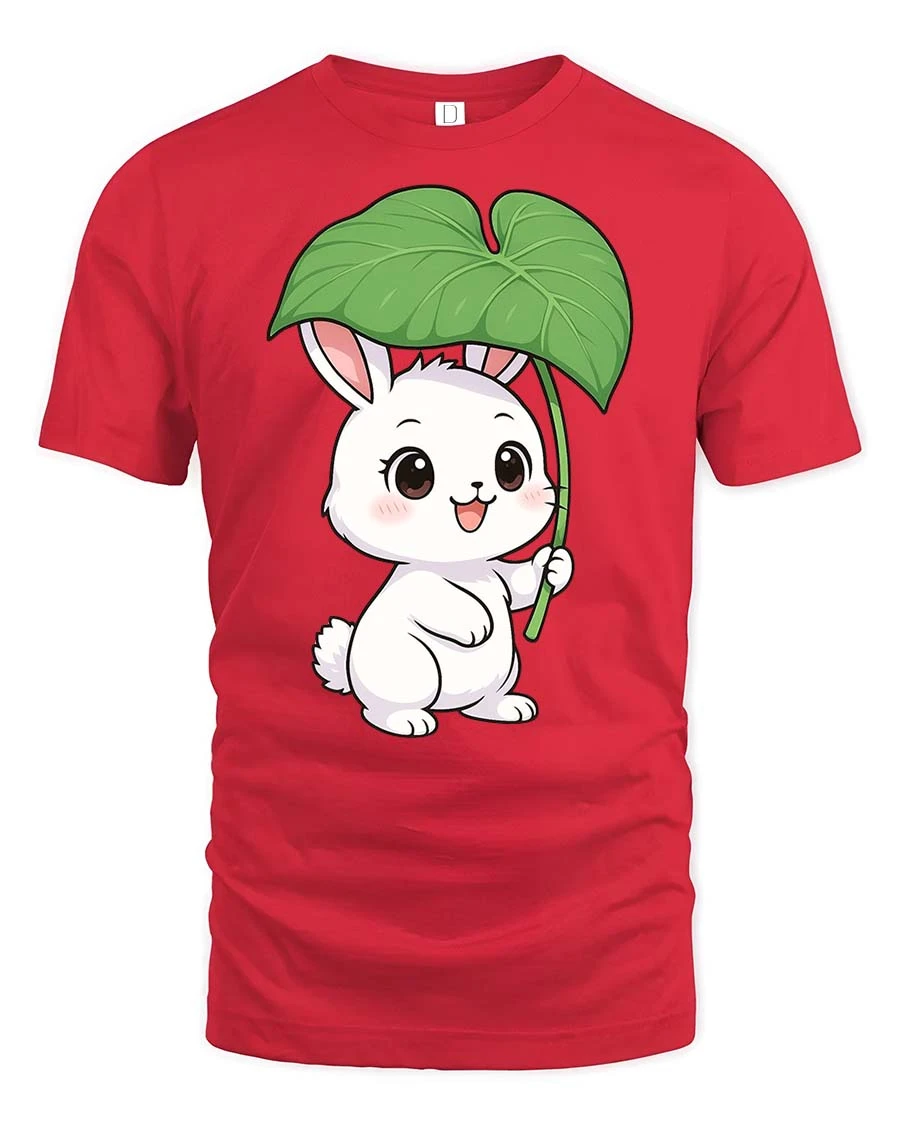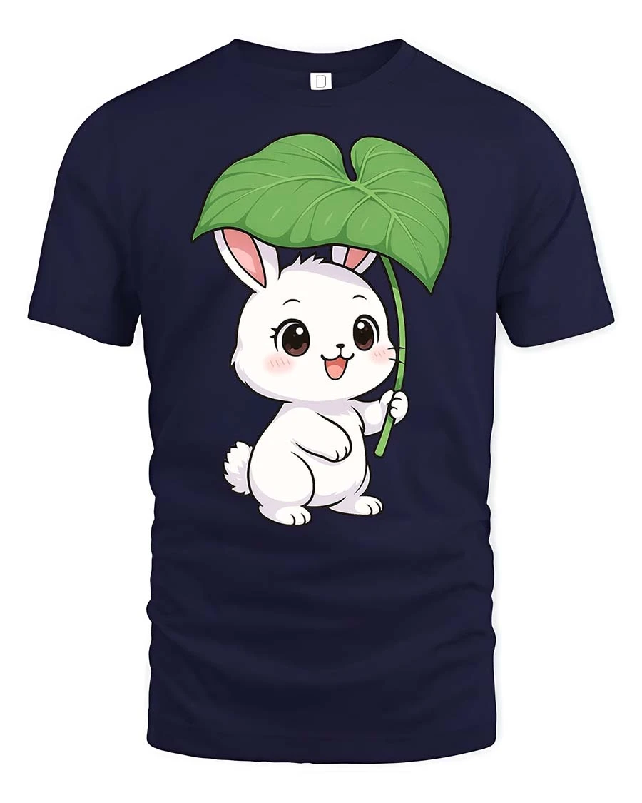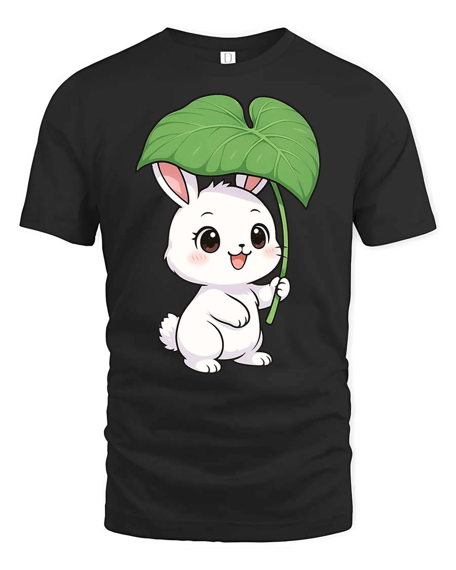 Featuring an adorable bunny holding a large leaf like an umbrella, this t-shirt creates a soft and cheerful visual that stands out.