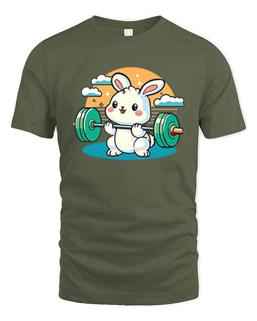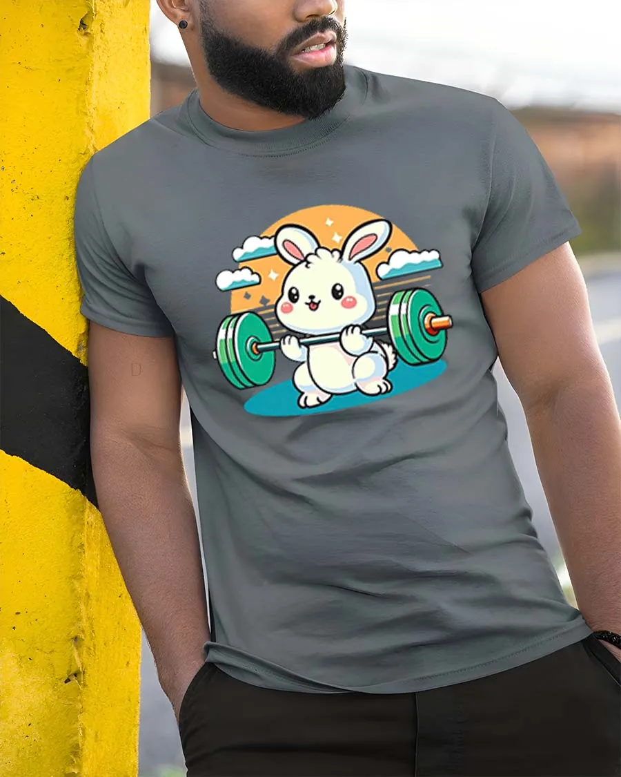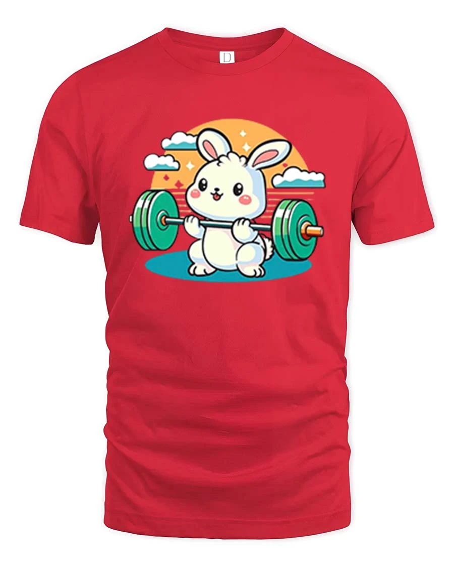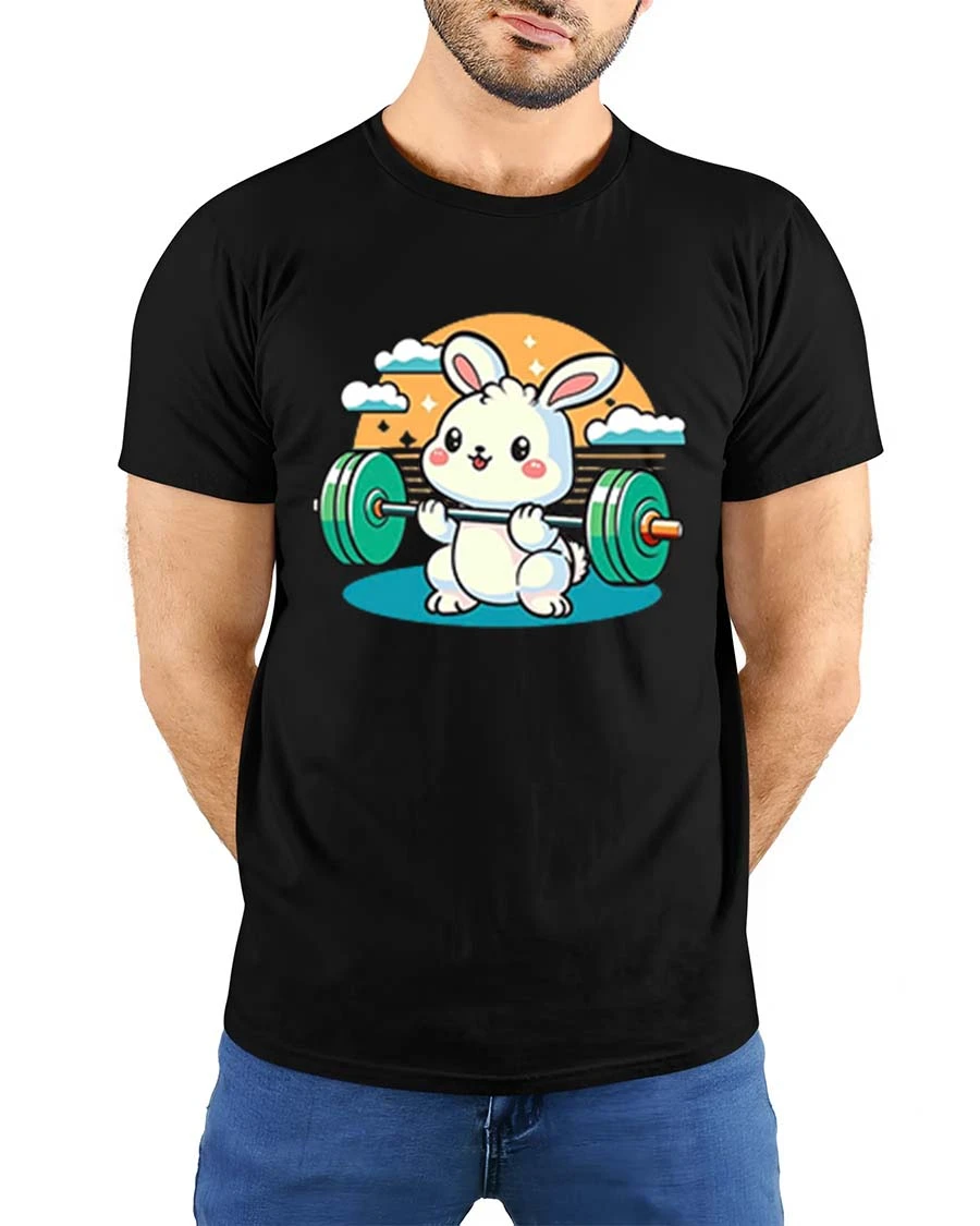 This cute bunny gym t-shirt is a great choice for anyone who loves workout motivation, cartoon animals, and lighthearted fitness apparel.