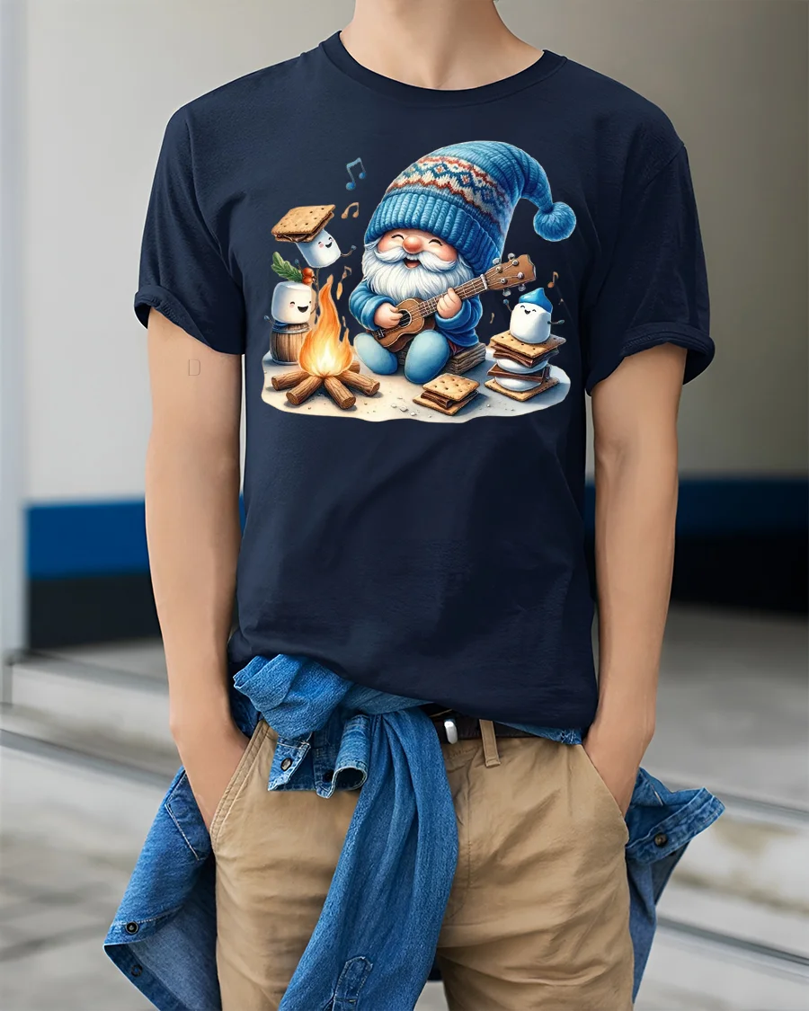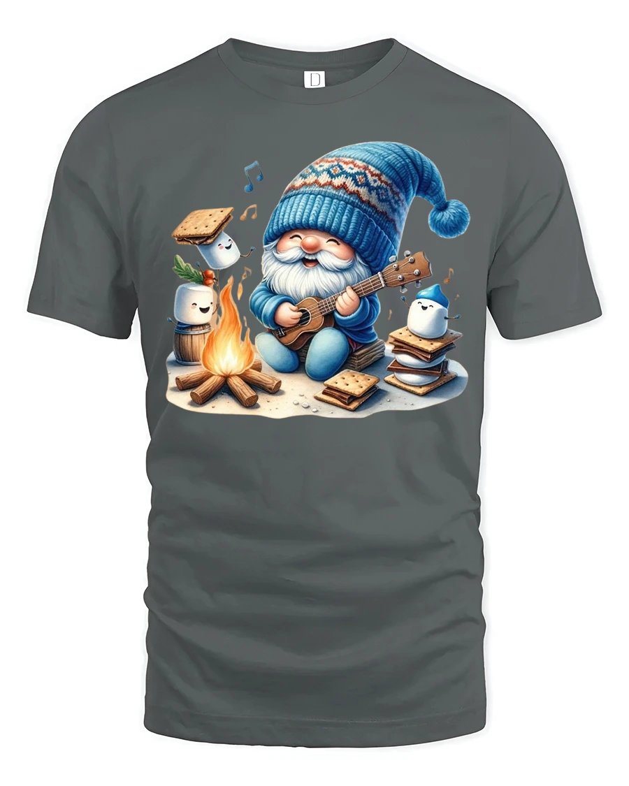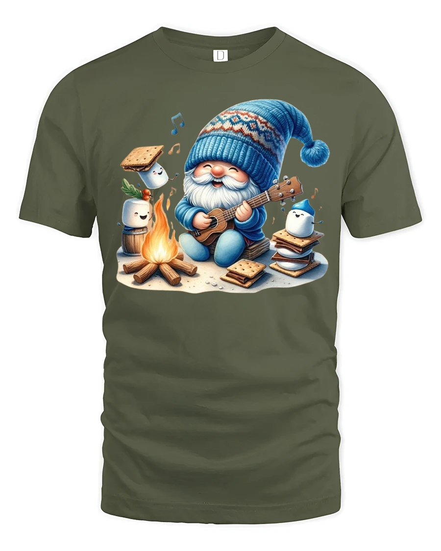 Cute Campfire Gnome Playing Ukulele Cozy Graphic Tee Tshirt brings warmth charm and peaceful joy into a heartwarming illustrated design.