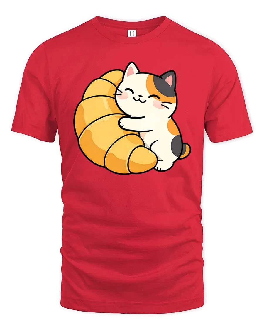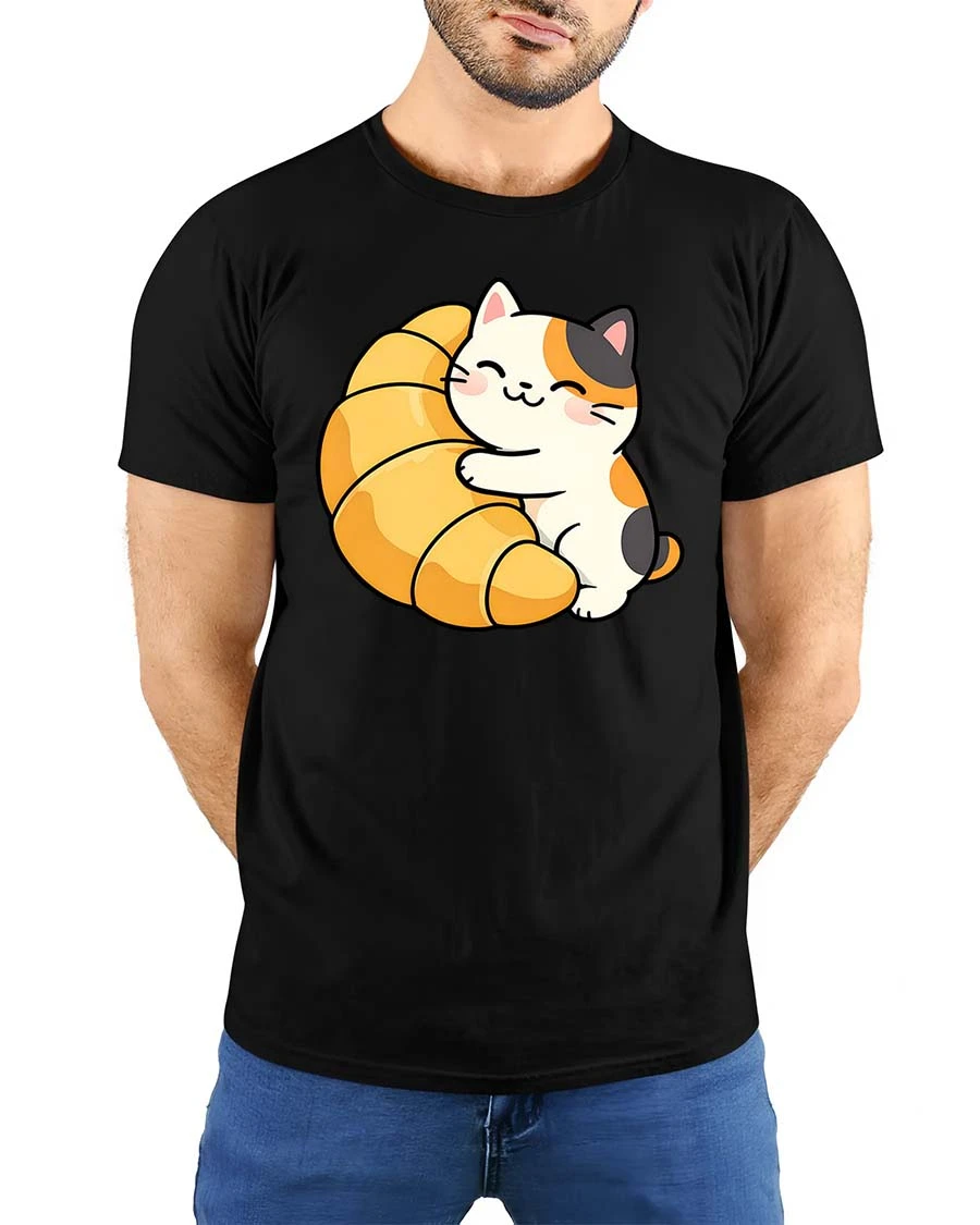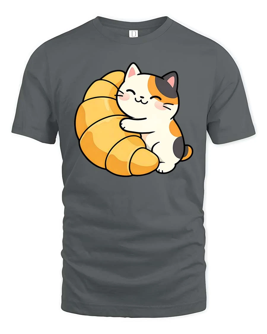 Featuring an adorable cat hugging a buttery croissant, this t-shirt brings a warm, cozy, and playful vibe to your outfit.