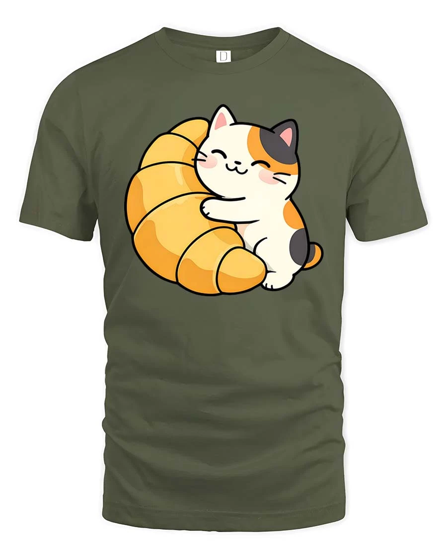 Cute Cat Croissant Graphic T-Shirt Kawaii Food Lover Tee - military green t-shirt on white background