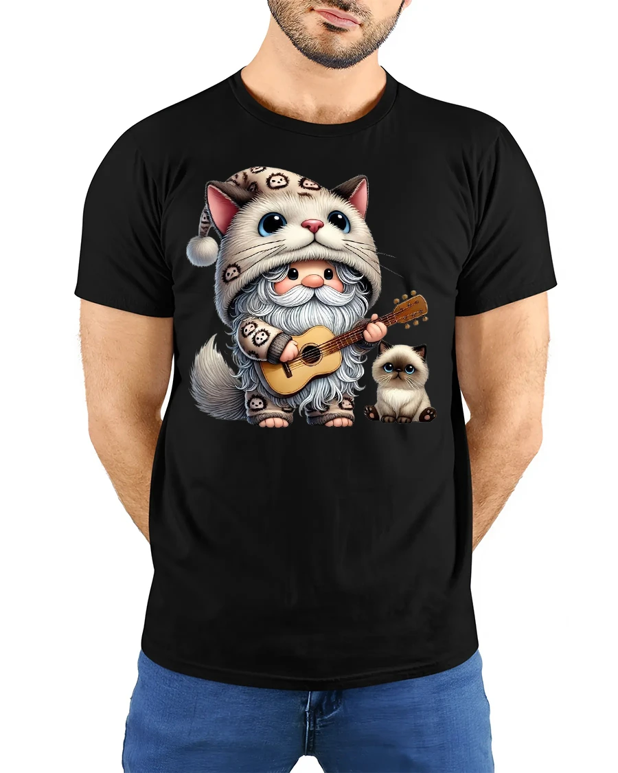 Bring charm and laughter to your wardrobe with the Cute Cat Gnome Guitar Graphic Funny Printed T-Shirt. This playful design features an adorable gnome dressed in a cozy cat hoodie, strumming a guitar alongside a cute kitten companion. The blend of fantasy gnome art with lovable cats creates a whimsical design that’s perfect for animal lovers and music fans alike.