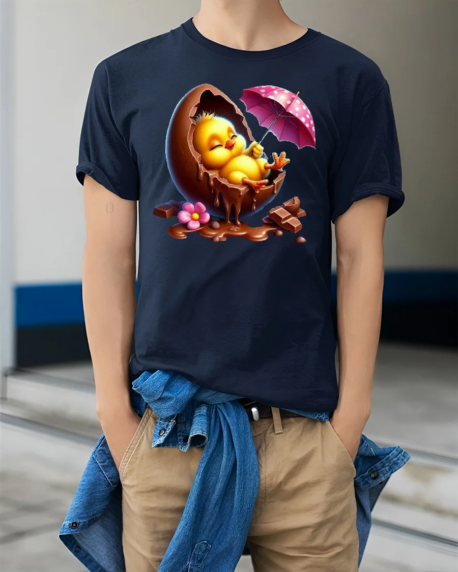 This playful design features a happy yellow chick relaxing inside a melting chocolate egg, holding a cute umbrella under candy-colored drops.