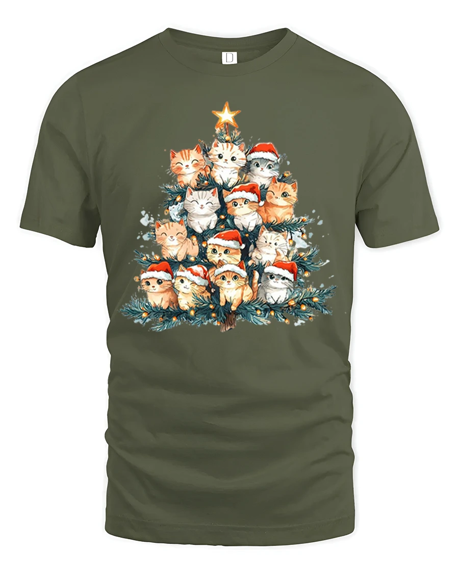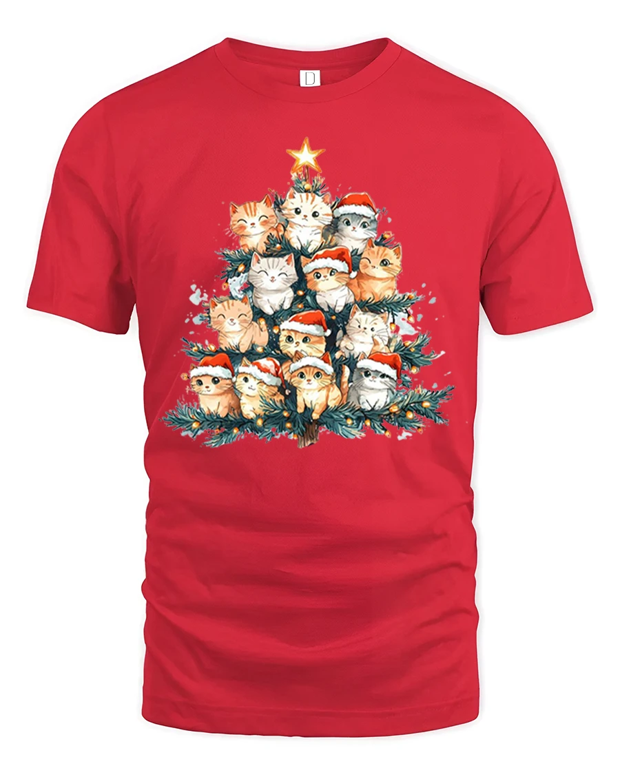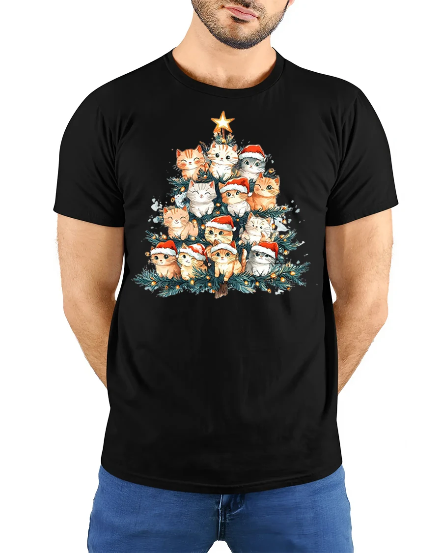 The Cute Christmas Cat Tree Santa Hat Holiday Lights Graphic Tee brings joyful holiday charm to your wardrobe with an adorable twist. Featuring a tree-shaped arrangement of sweet kittens wearing festive Santa hats, this design glows with warm Christmas lights and a bright star at the top. The detailed artwork blends cozy holiday vibes with playful feline personality, making it perfect for cat lovers who enjoy celebrating the season in a fun and heartwarming style.