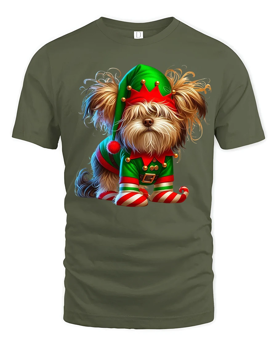 Cute Christmas Elf Dog Graphic Tee With Playful Holiday Charm - military green t-shirt on white background