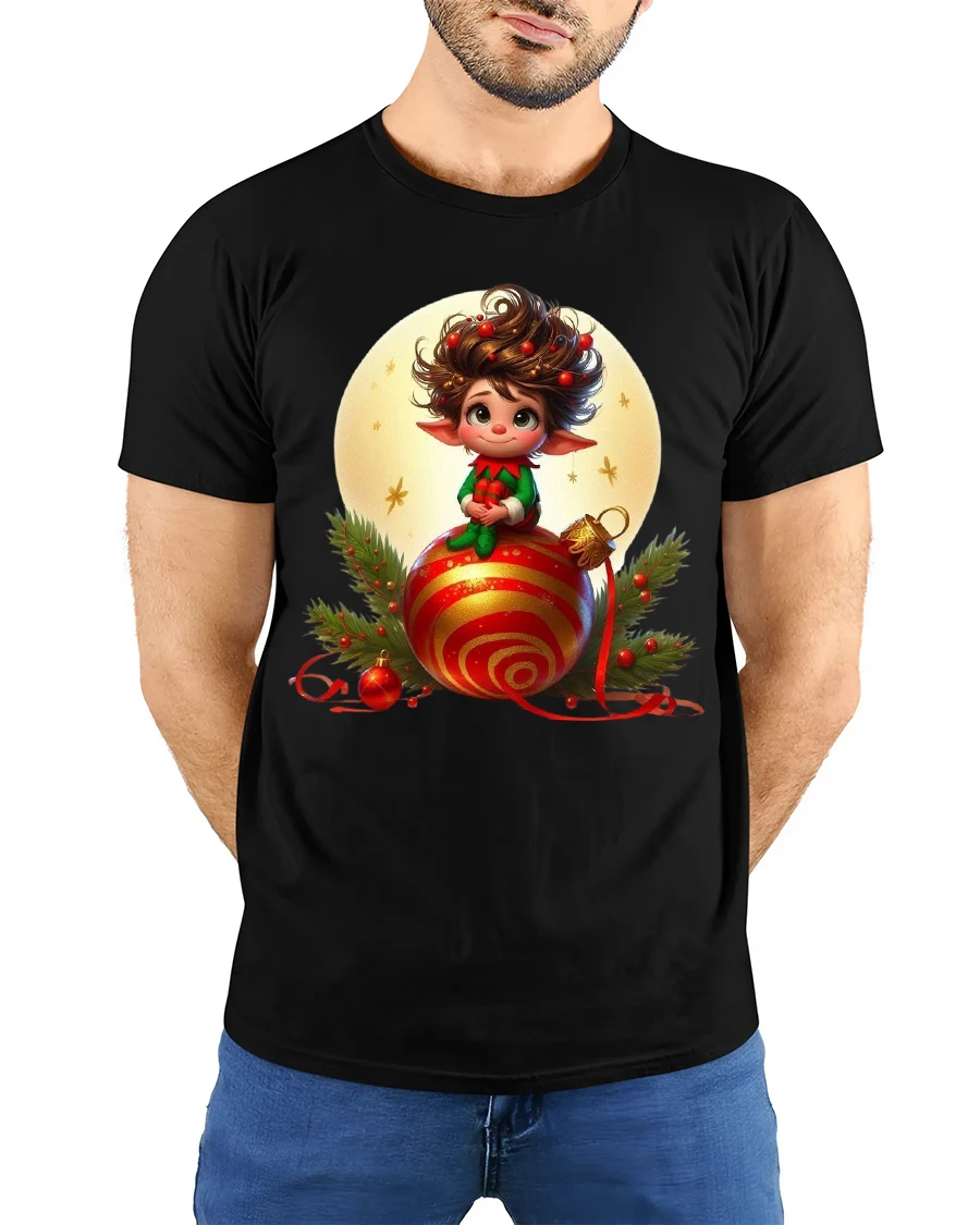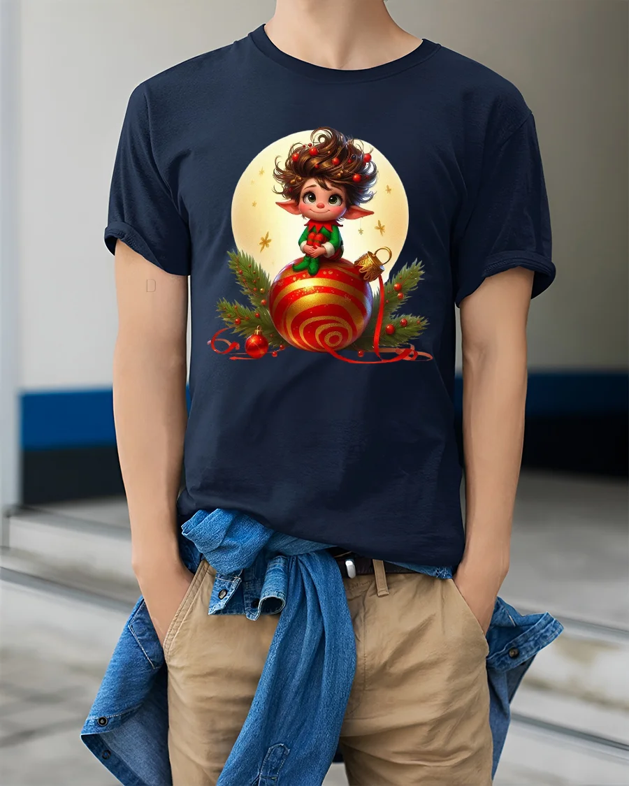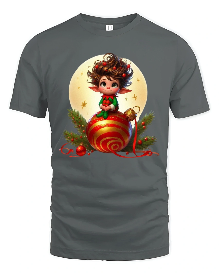 Cute Christmas Elf Sitting On Ornament Festive Graphic Tee captures the magic and joy of the holiday season in a playful and heartwarming design.