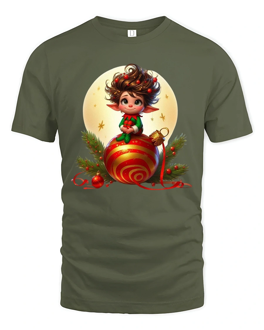 Cute Christmas Elf Sitting On Ornament Festive Graphic Tee - military green t-shirt on white background