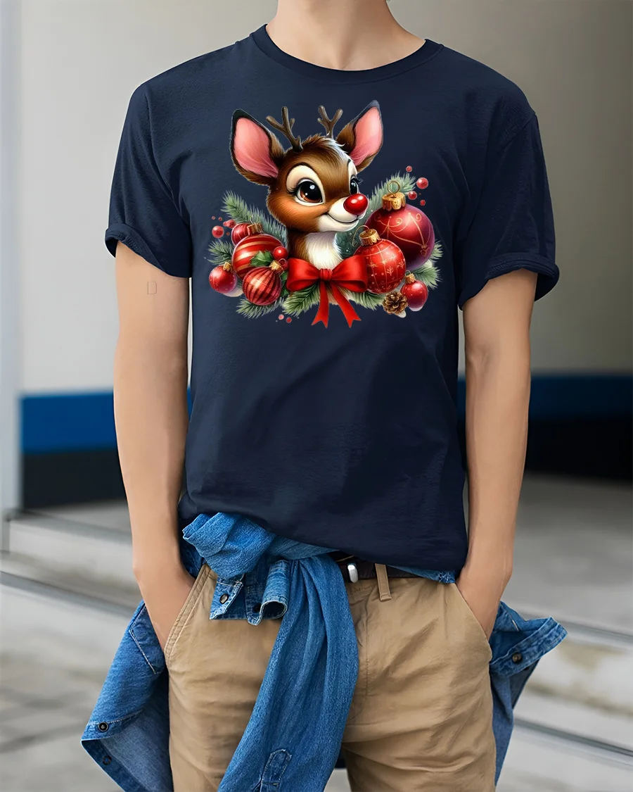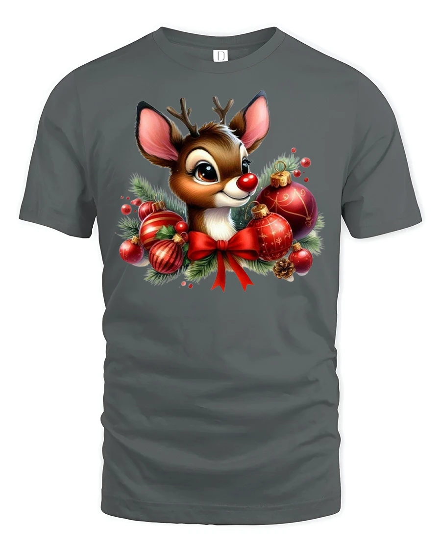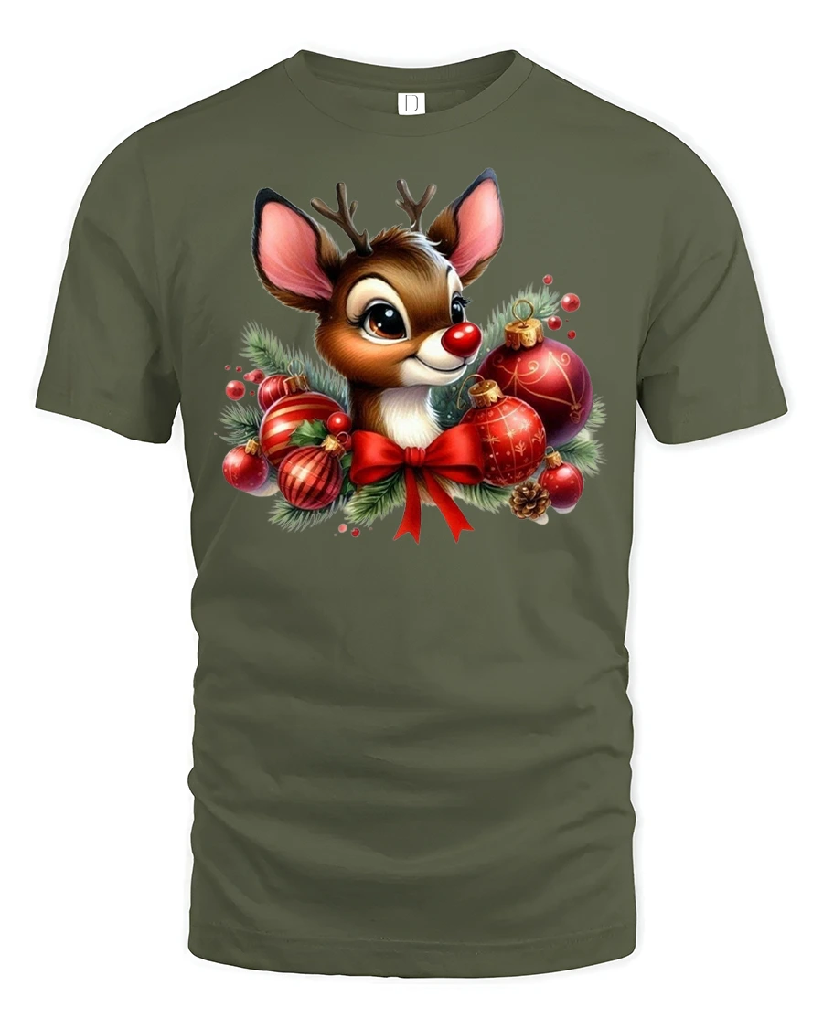 Cute Christmas Reindeer Tee Adorable Holiday Ornament Tshirt brings the magic of the season to life with a bright and cheerful design. Featuring an adorable red-nosed reindeer surrounded by sparkling ornaments, pine greenery, and a festive red bow, this tee captures everything people love about Christmas charm and holiday cheer. The bold colors and sweet expression make it a standout piece for the winter season.