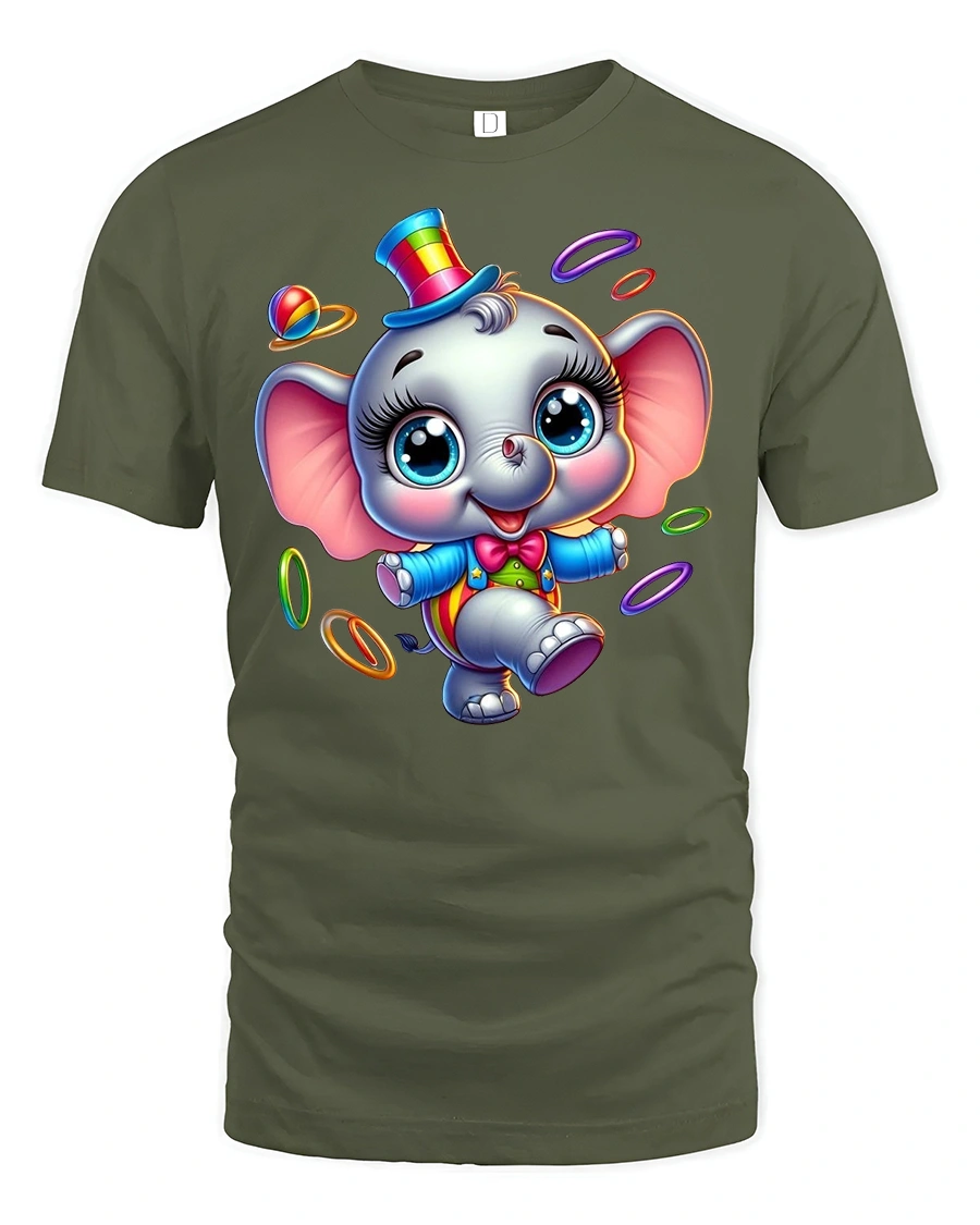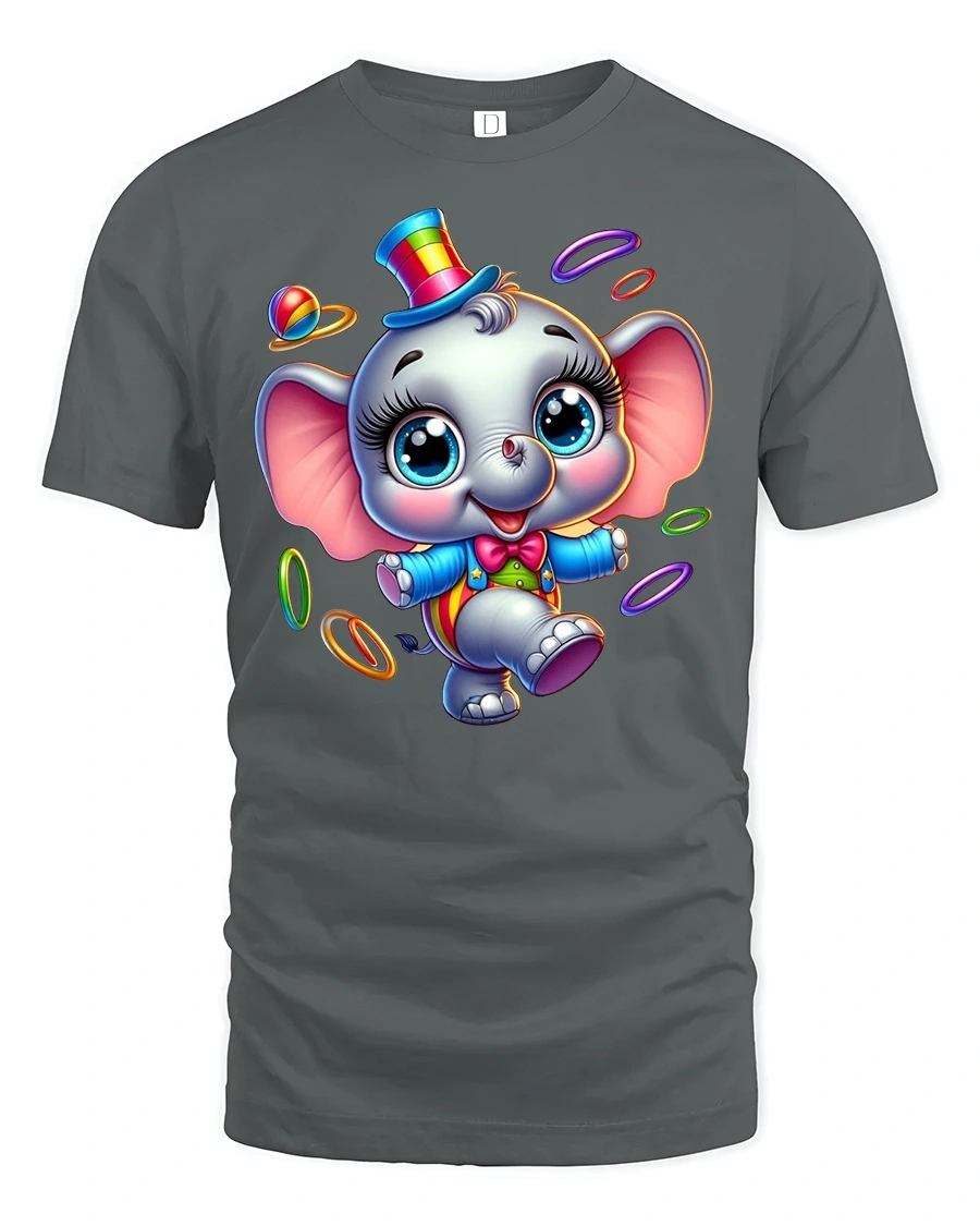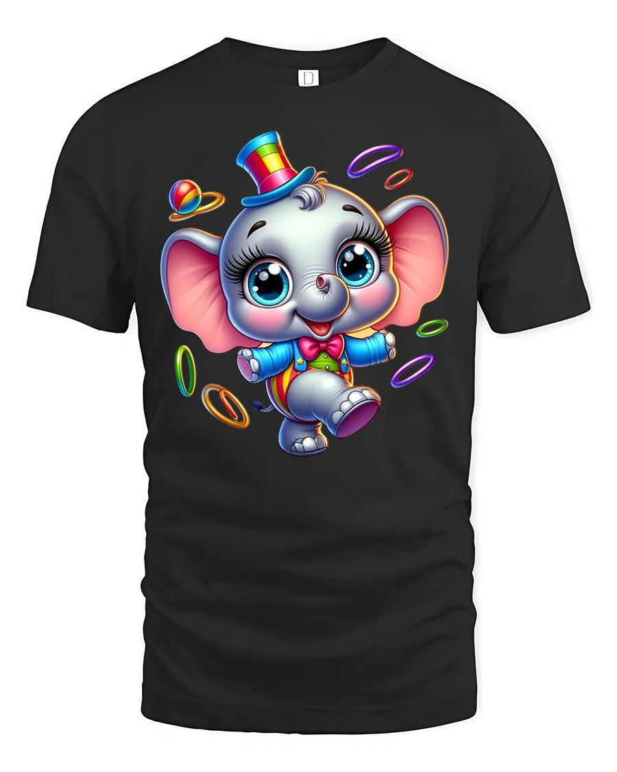 Cute Circus Elephant Juggling Rings Printed T-shirt brings joy and color to your wardrobe with its playful design. Featuring an adorable baby elephant dressed in circus attire, complete with a rainbow top hat and juggling rings, this tee is perfect for anyone who loves fun, cheerful, and vibrant graphics. The cute big-eyed elephant design makes it appealing for both kids and adults who enjoy whimsical fashion.