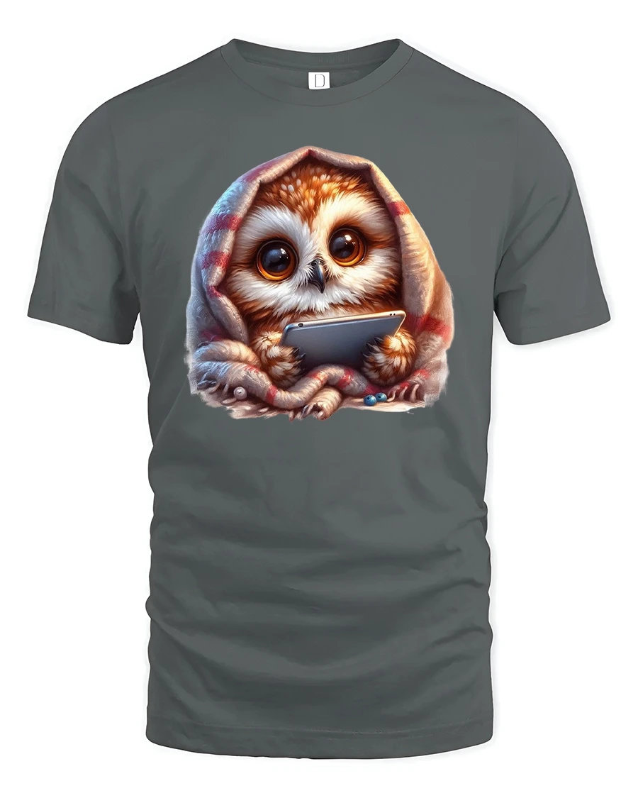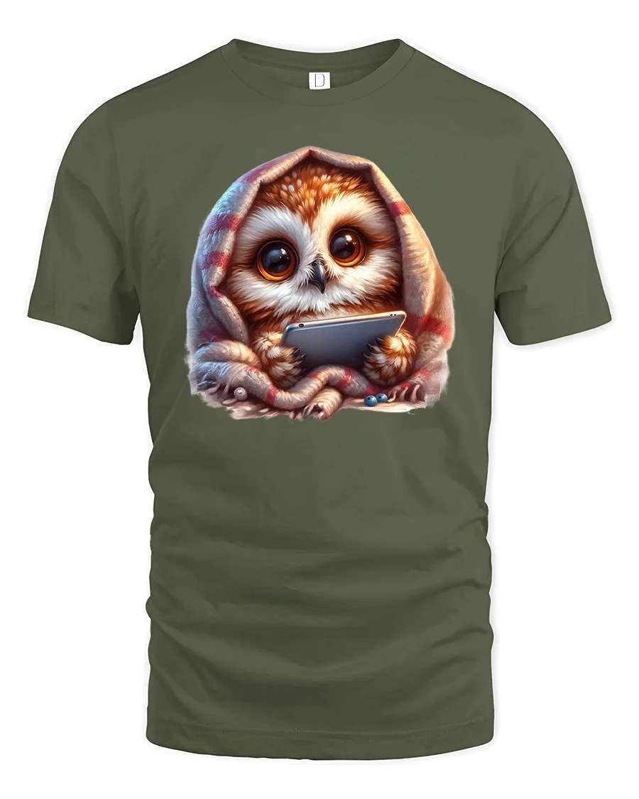 Stay comfy and adorable in this Cute Cozy Owl with Blanket Funny Lazy Day Graphic Tee, featuring a wide-eyed owl snug under a blanket holding a tablet.