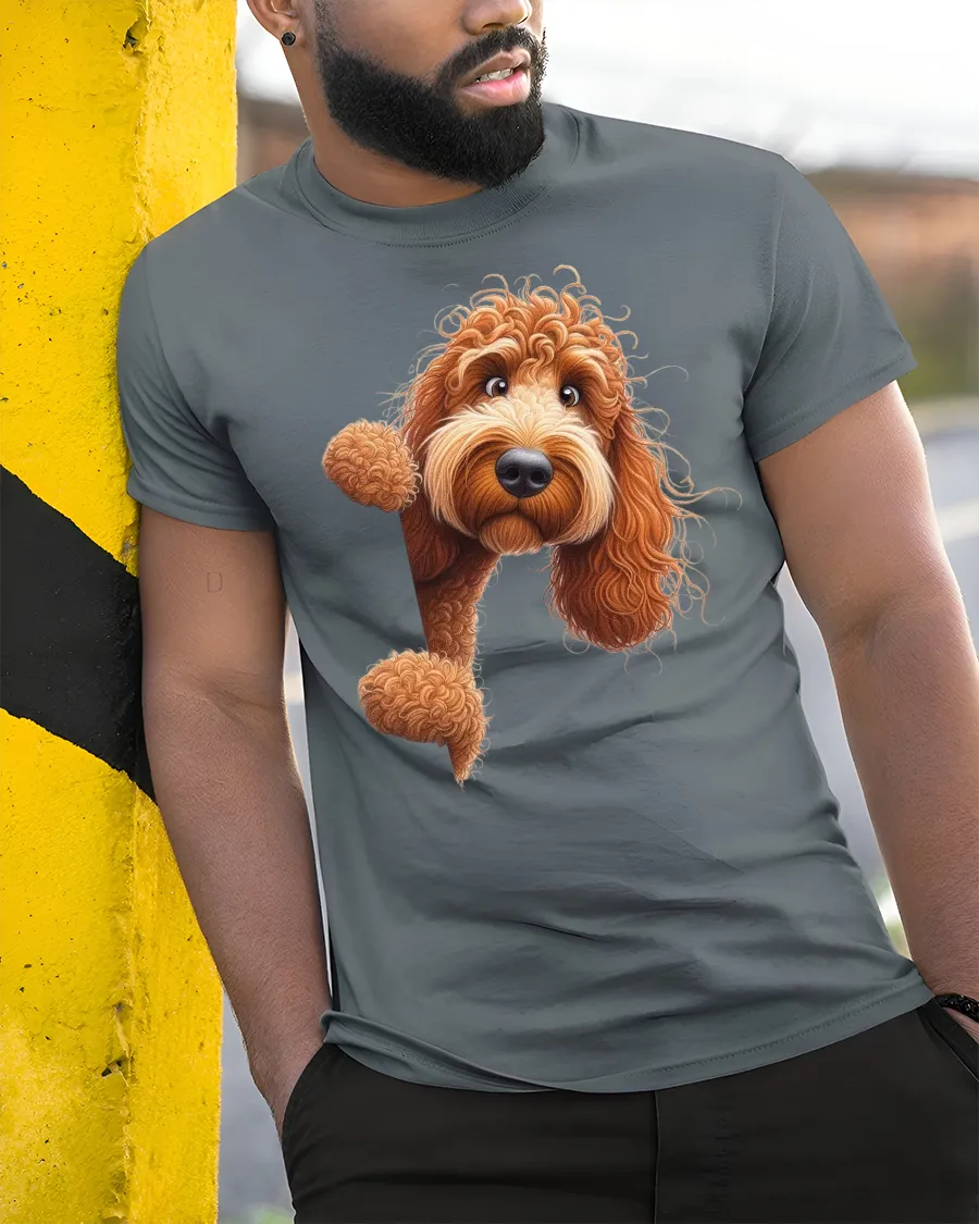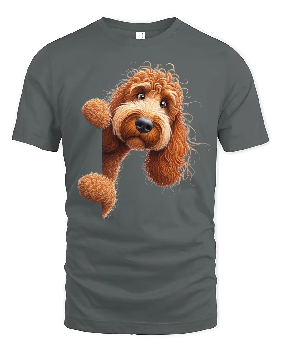 Our Cute Curly Dog Peekaboo Cartoon Graphic Tee for Dog Lovers brings irresistible charm to your everyday wardrobe. Featuring an adorable curly-haired pup peeking out with bright eyes and fluffy curls, this design captures the warmth and playfulness that dog lovers adore. The realistic texture and detailed art style make the pup look like it is popping right off the shirt with a friendly hello.