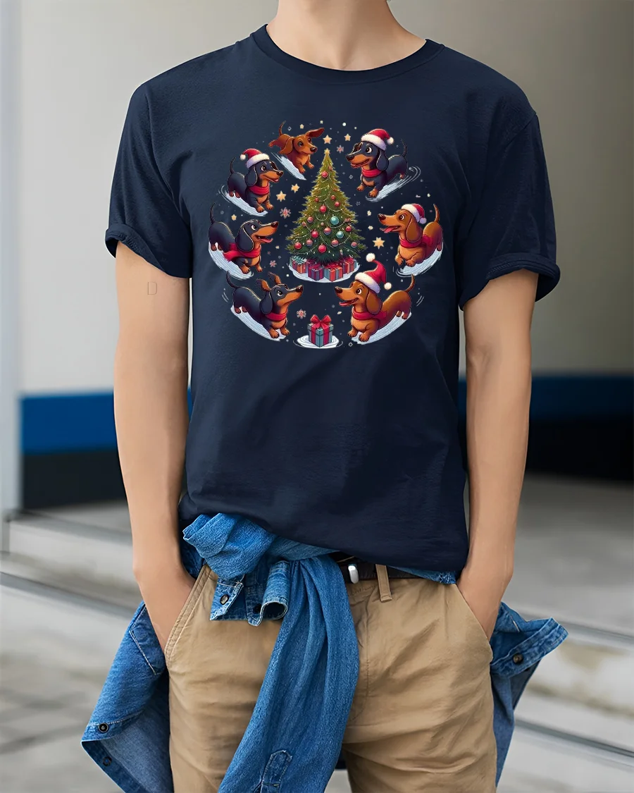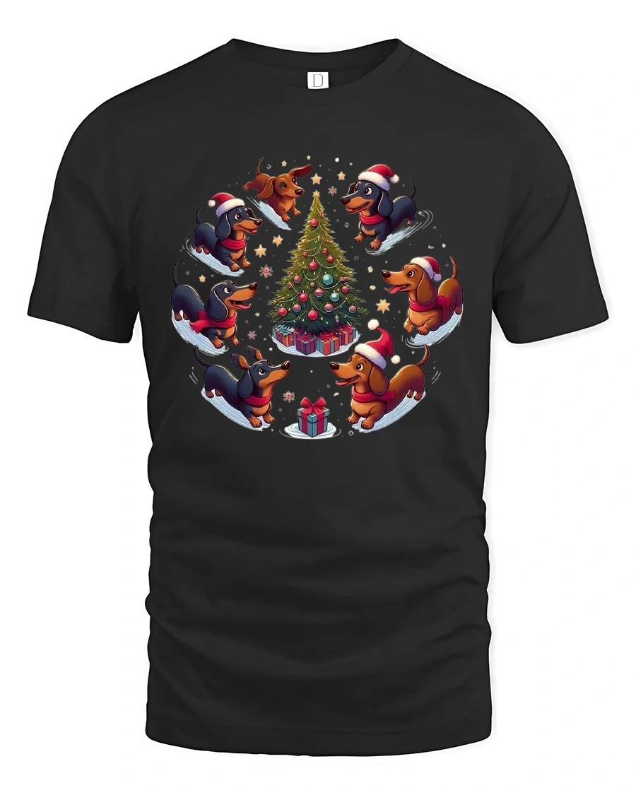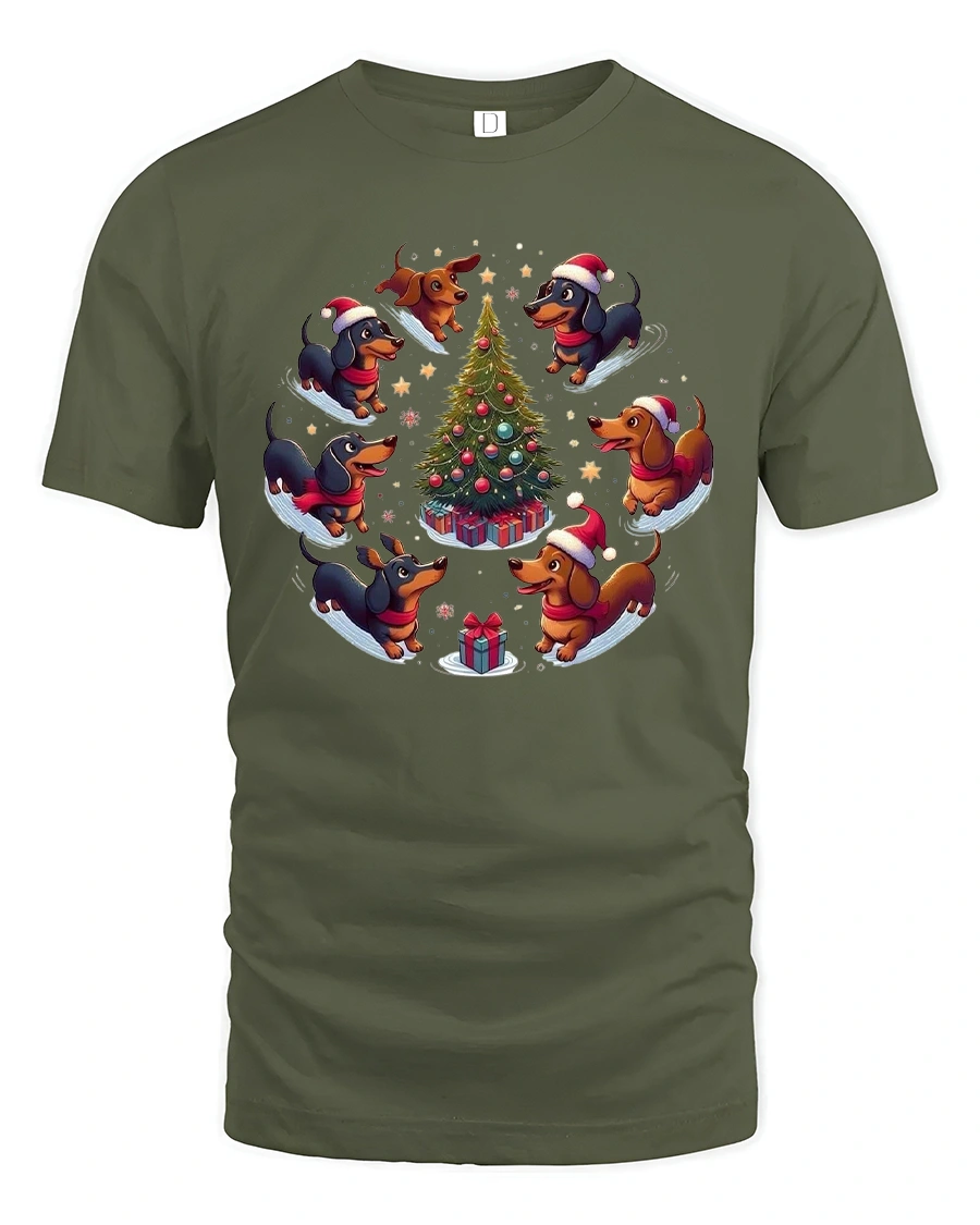 Celebrate the holidays with playful charm in this dachshund christmas t shirt featuring a delightful circle of adorable dachshund dogs dancing around a decorated Christmas tree.