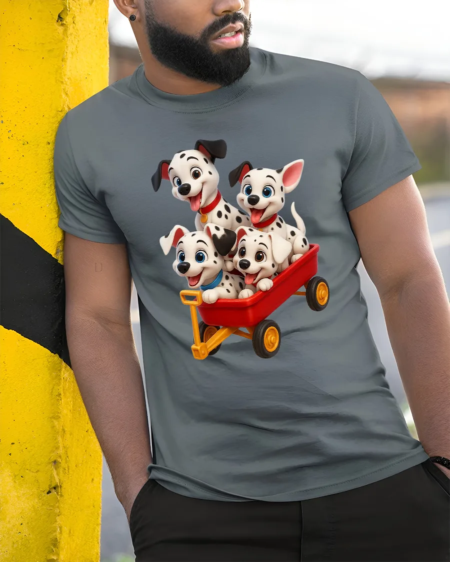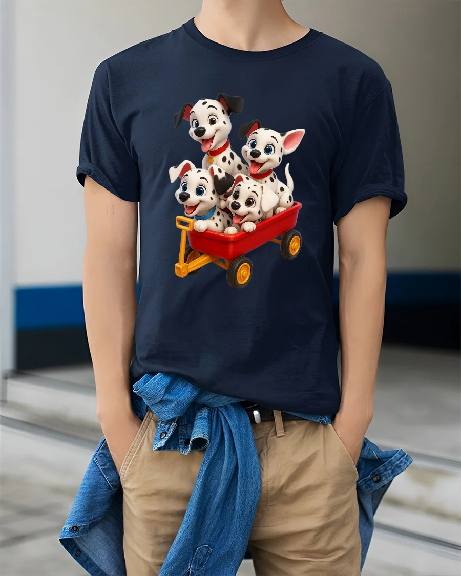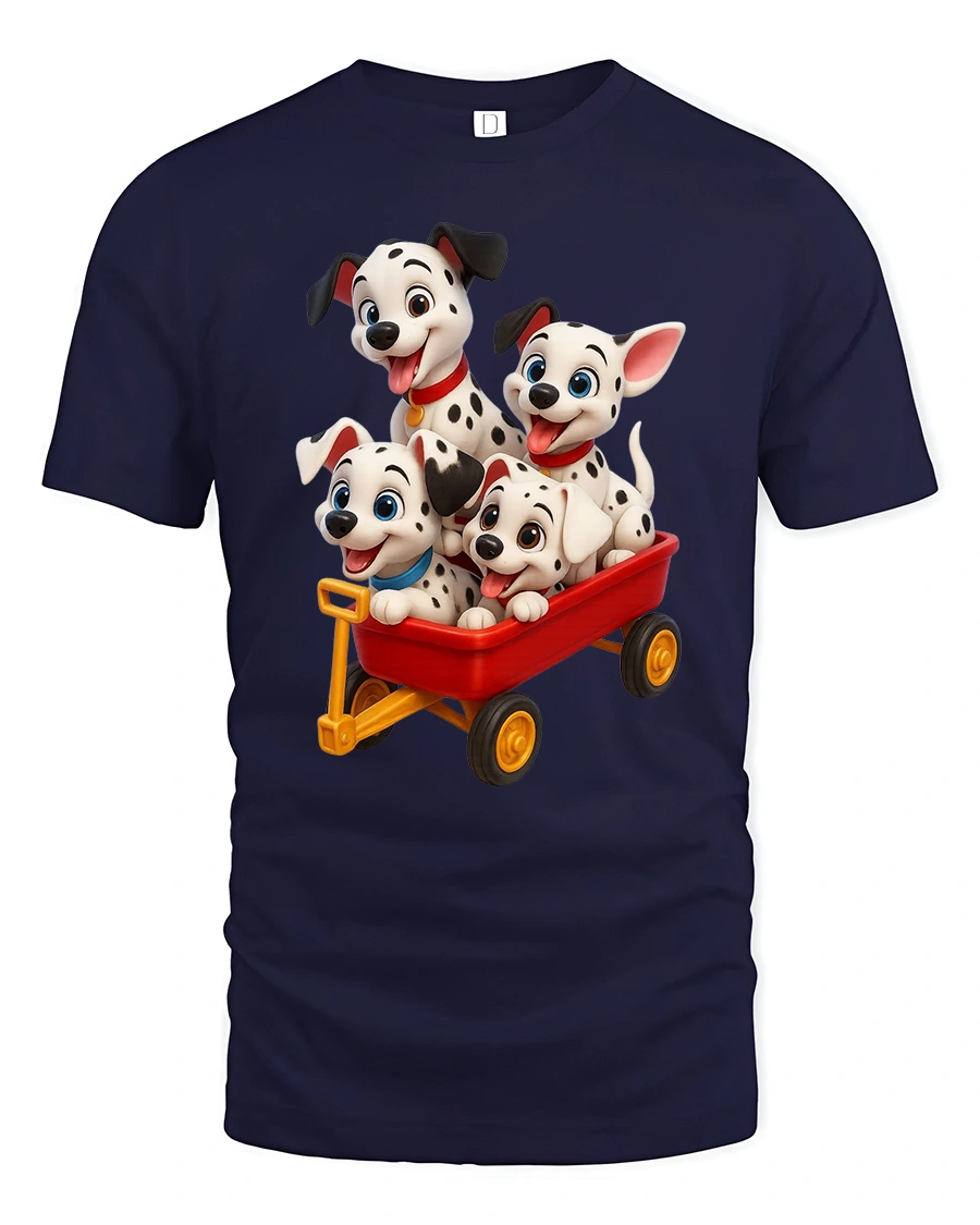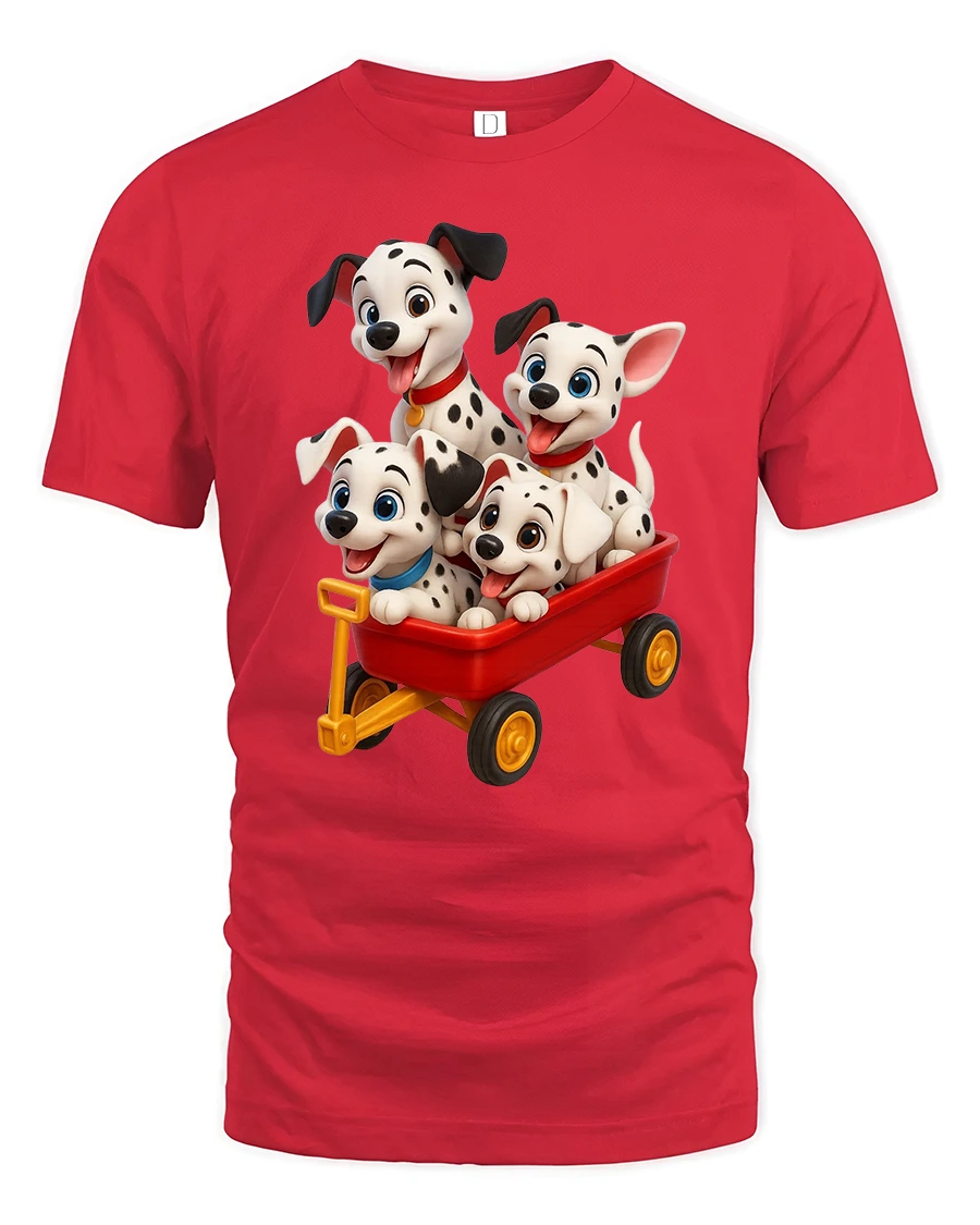 The Cute Dalmatian Puppies Red Wagon Fun Adventure Graphic Tee brings irresistible charm and playful energy to any outfit. Featuring four joyful Dalmatian puppies riding together in a bright red wagon, this design captures the sweetness, curiosity, and excitement that puppy lovers adore. Each pup shows animated expression and adorable details, making the artwork feel lively and heartwarming.