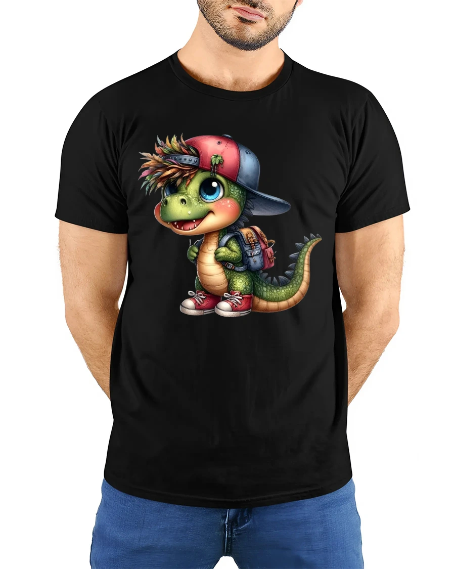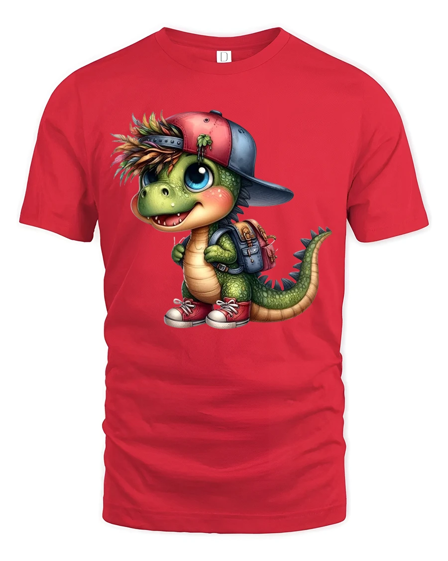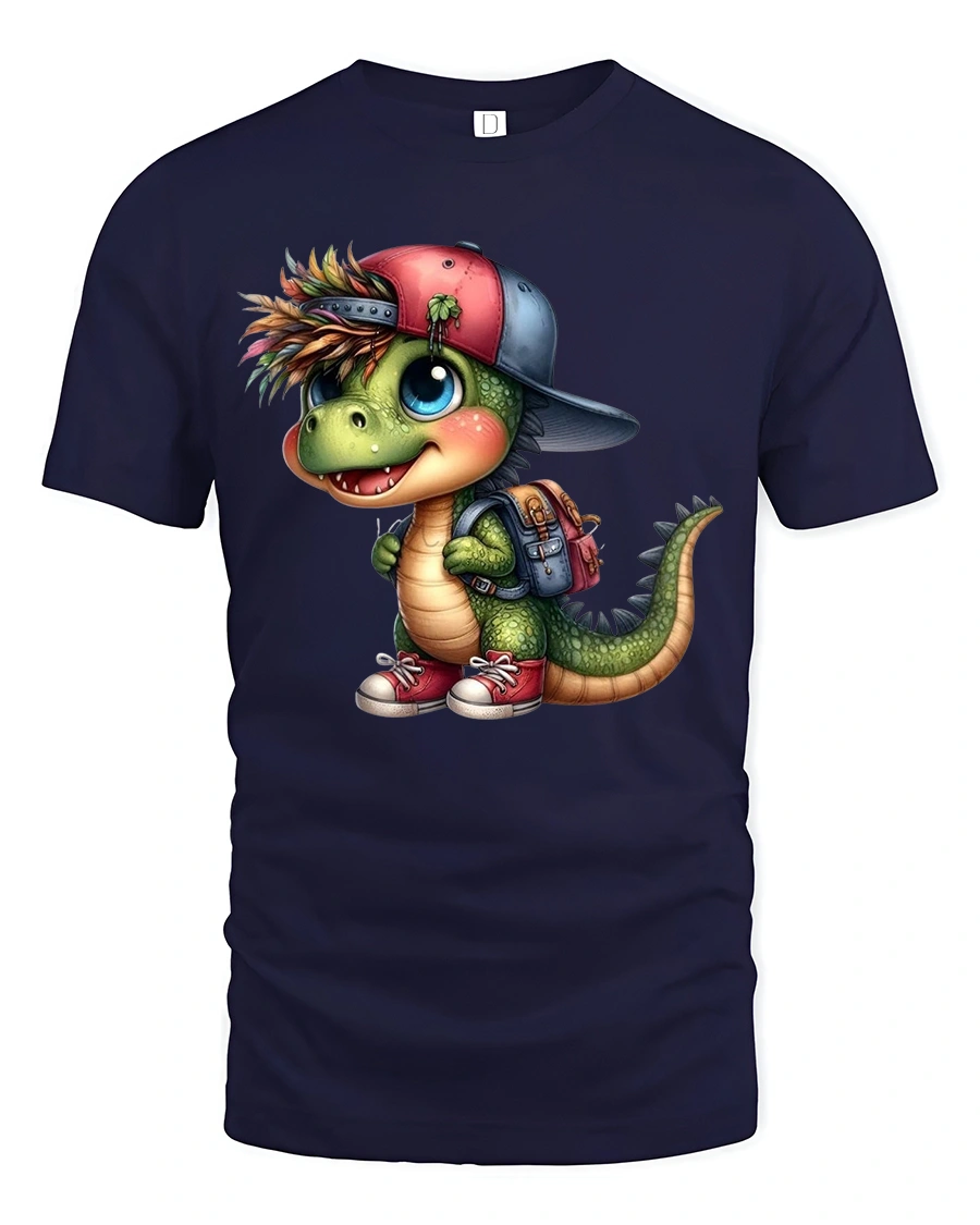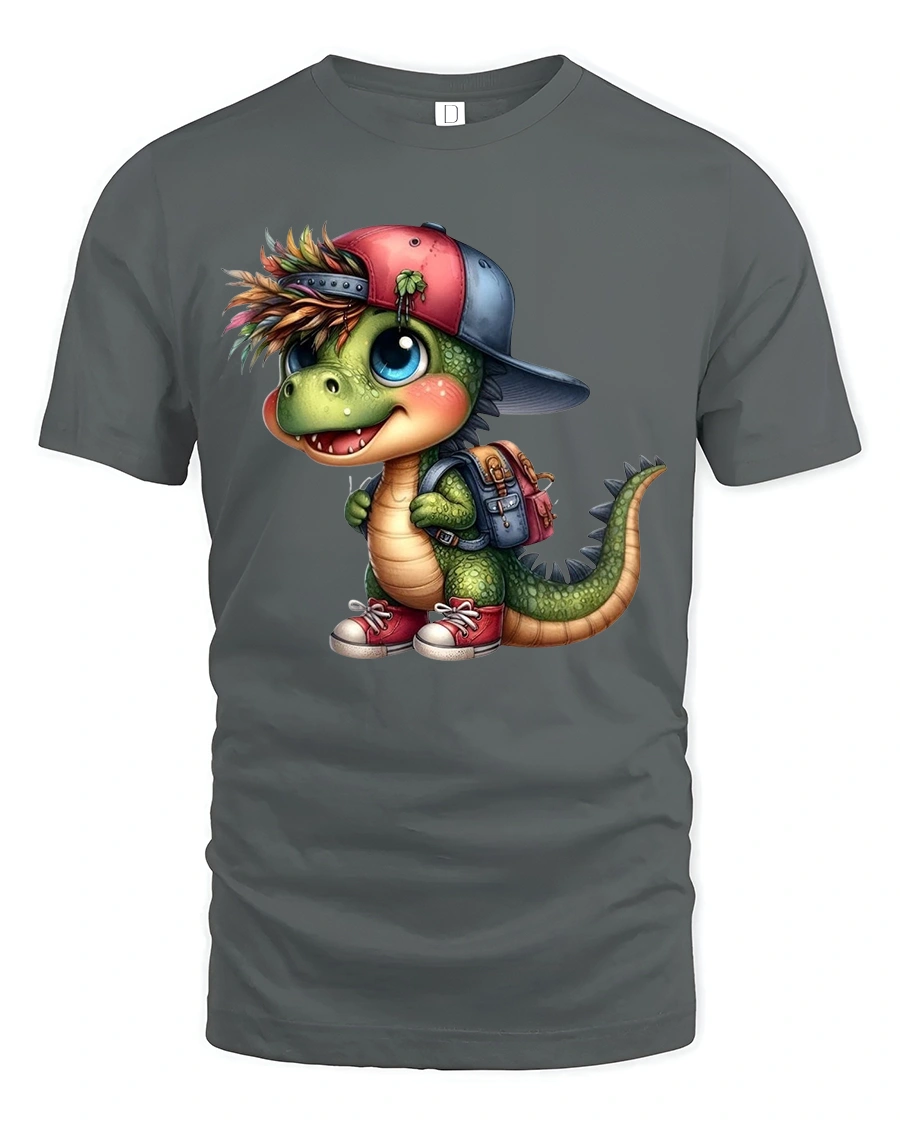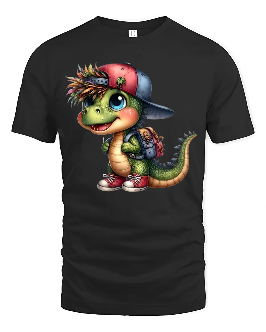 Featuring an adorable cartoon dinosaur wearing a cap sneakers and backpack this design delivers a youthful fun personality.
