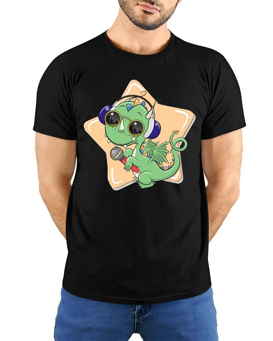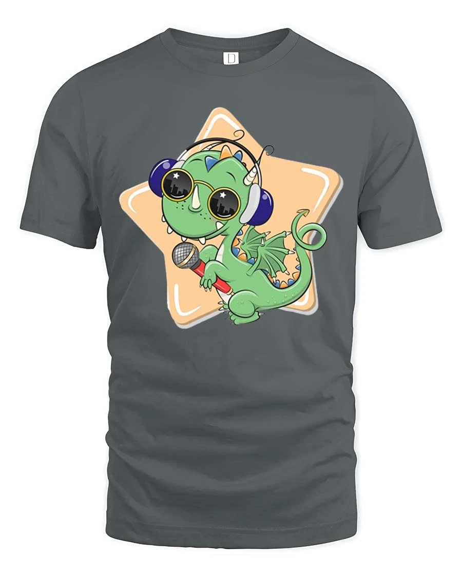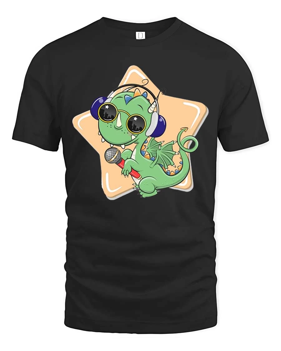 The Cute Dragon Singer Cartoon Graphic T-Shirt features an adorable little dragon wearing headphones and sunglasses while singing into a microphone. The playful character design combines music and fantasy in a fun cartoon style that creates a cheerful and energetic look.