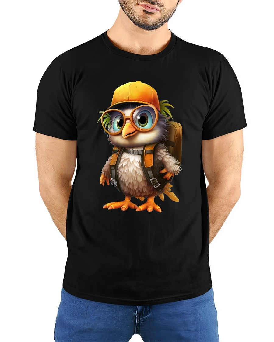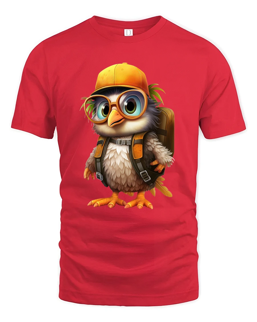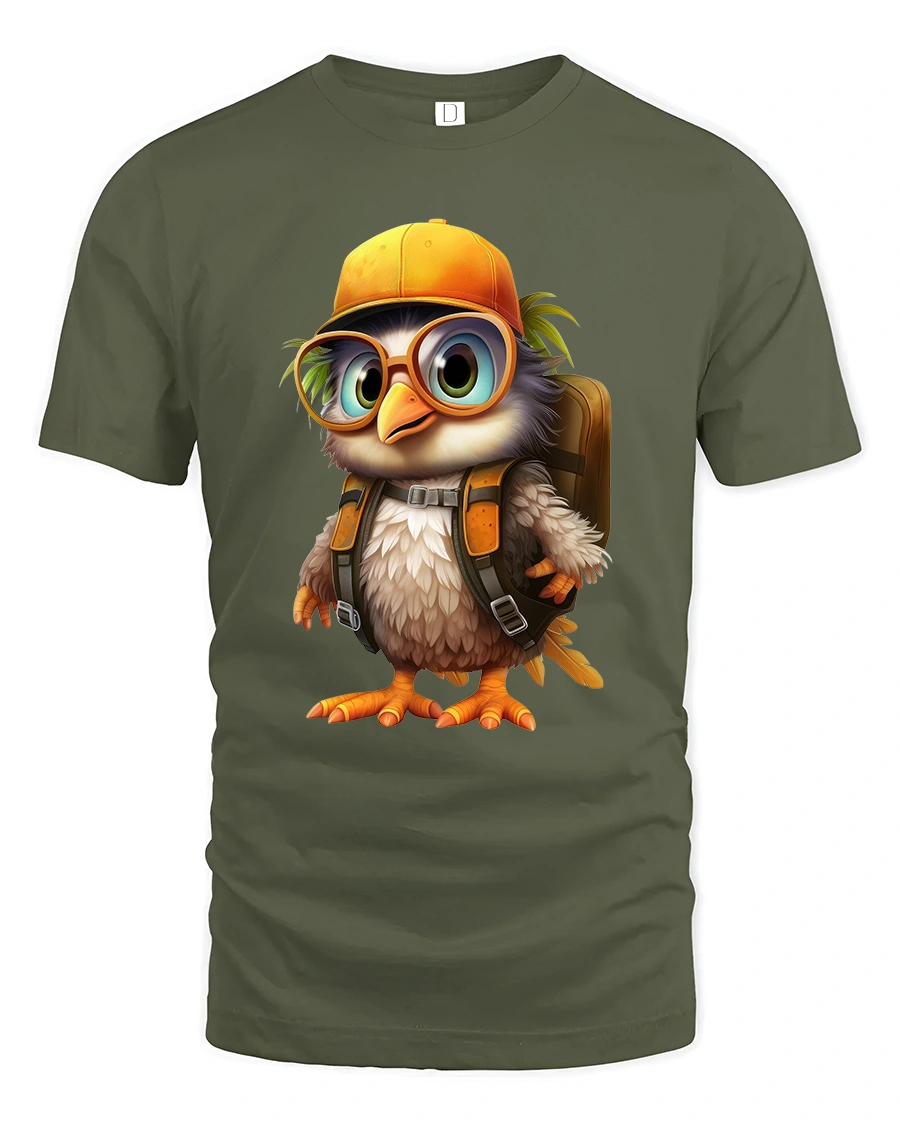 Cute Explorer Bird Tee Adorable Cartoon Bird With Backpack Art blends colorful cartoon styling with a cozy adventurous vibe.