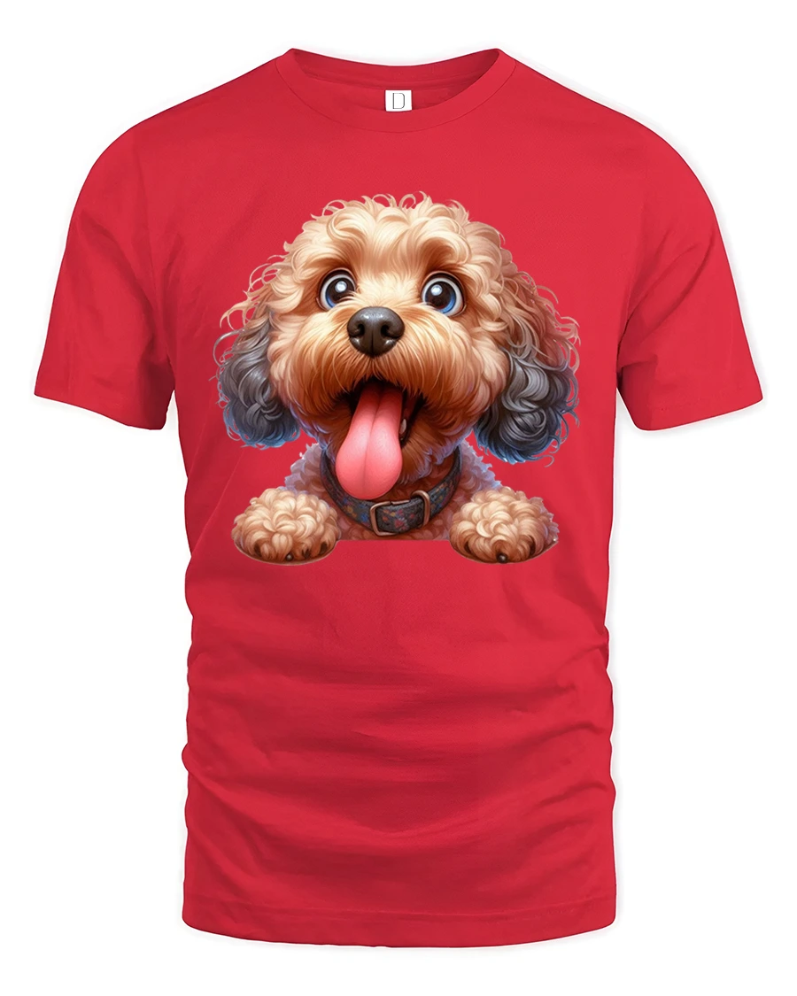 Cute Fluffy Doodle Dog Graphic Tee With Happy Tongue Out Smile - red t-shirt on white background