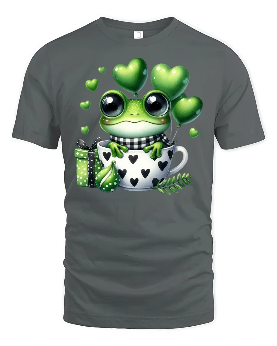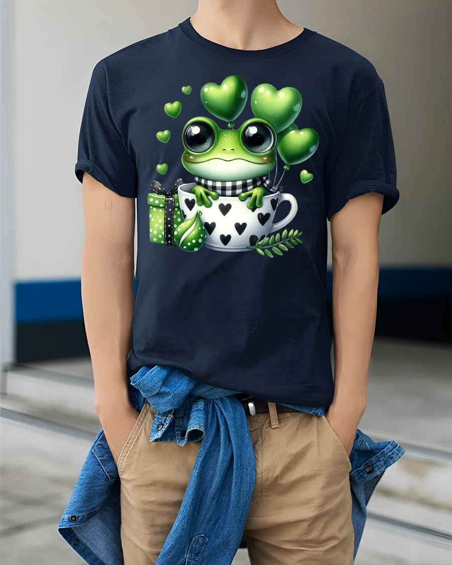 Cute Frog in Love Cup Funny Valentine Graphic T-shirt is the perfect blend of adorable charm and playful style. Featuring a sweet frog sitting inside a heart-patterned cup with green heart balloons, this tee is designed to make you smile. The lively details and cartoon-style design make it a fun choice for Valentine’s Day, anniversaries, or simply for frog lovers who enjoy unique and eye-catching apparel.