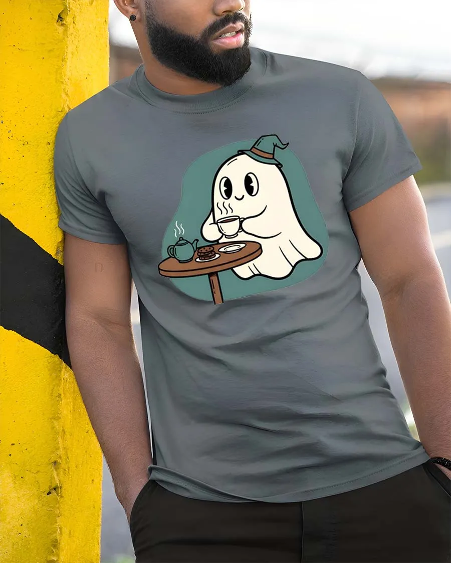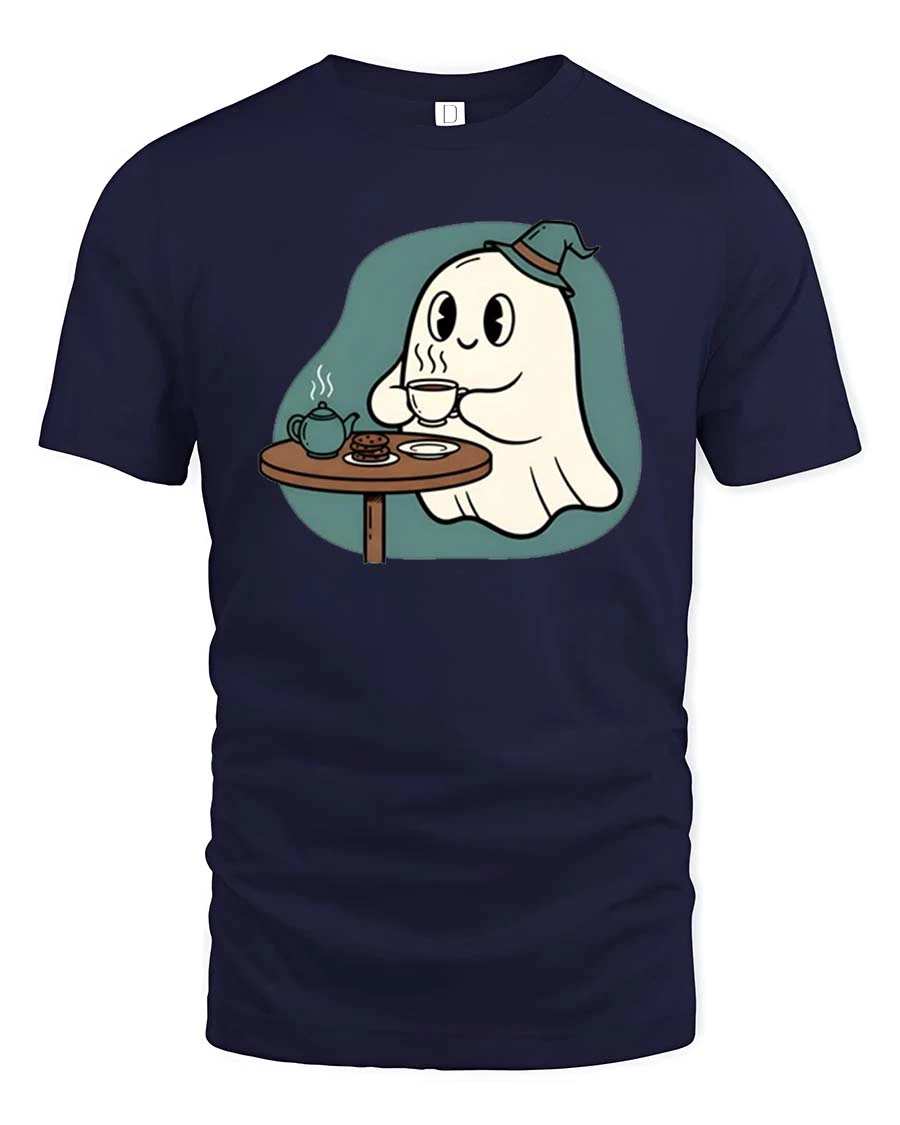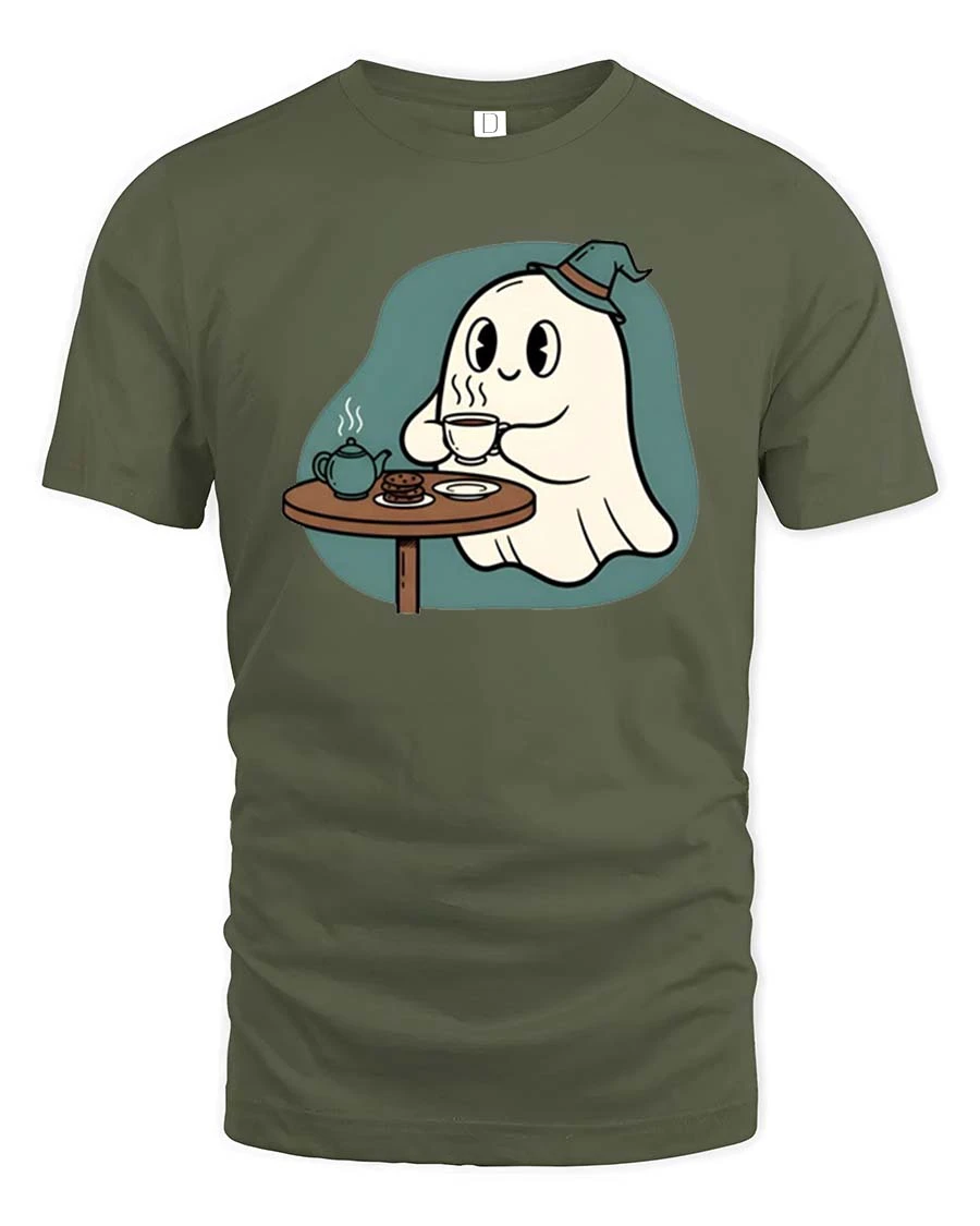 Cute Ghost Tea Time T-Shirt Cozy Halloween Cartoon Tee brings a charming and relaxing vibe to your everyday wardrobe.