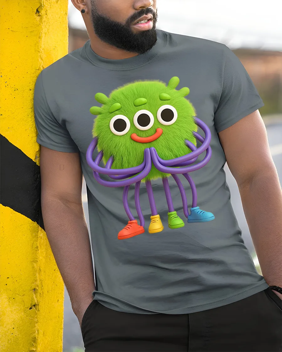 This alien t shirt features a cheerful green monster with three big eyes colorful sneakers and a friendly smile.