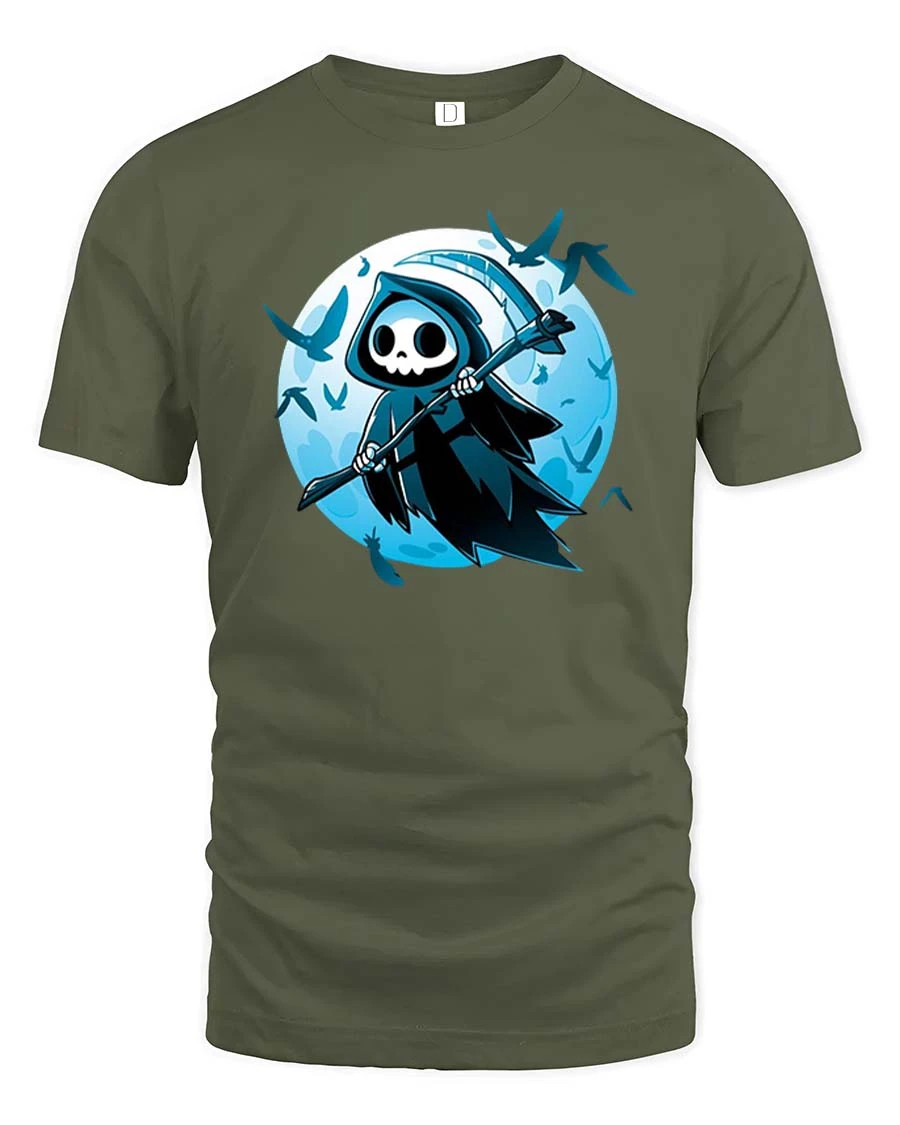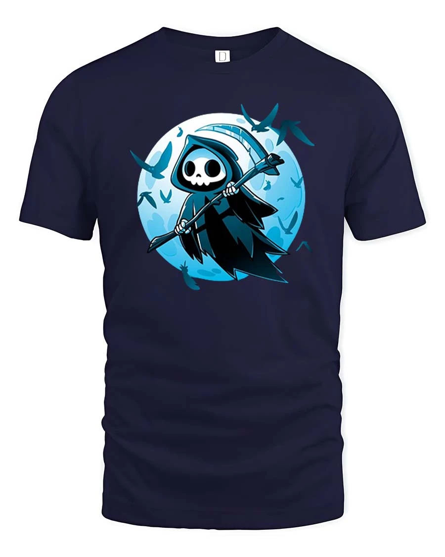 Featuring an adorable grim reaper holding a scythe against a glowing moon backdrop, this t-shirt creates a perfect balance of dark and cute aesthetics.