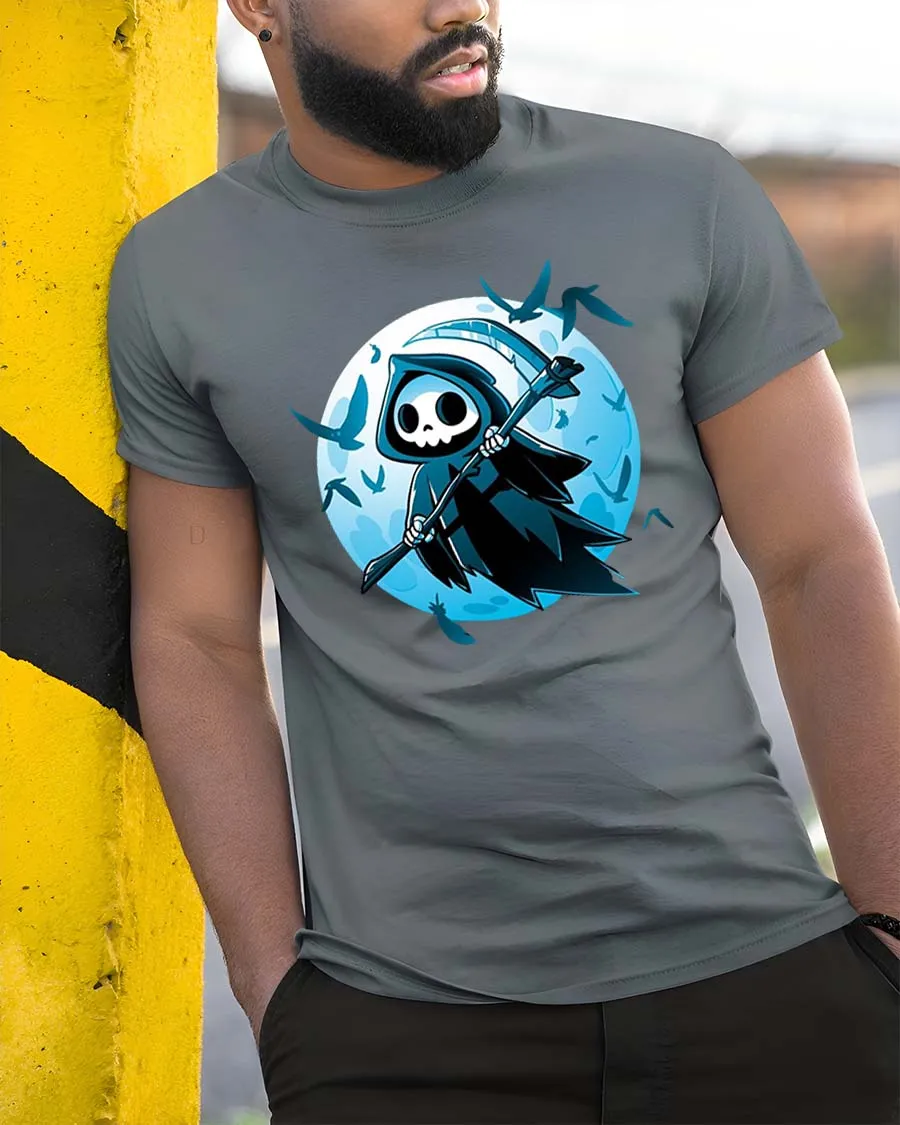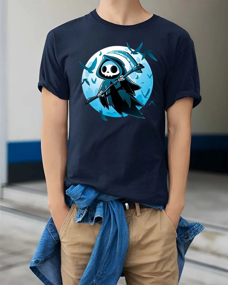 Cute Grim Reaper Cartoon Graphic T-Shirt Gothic Moon Tee blends spooky charm with a playful and artistic design.