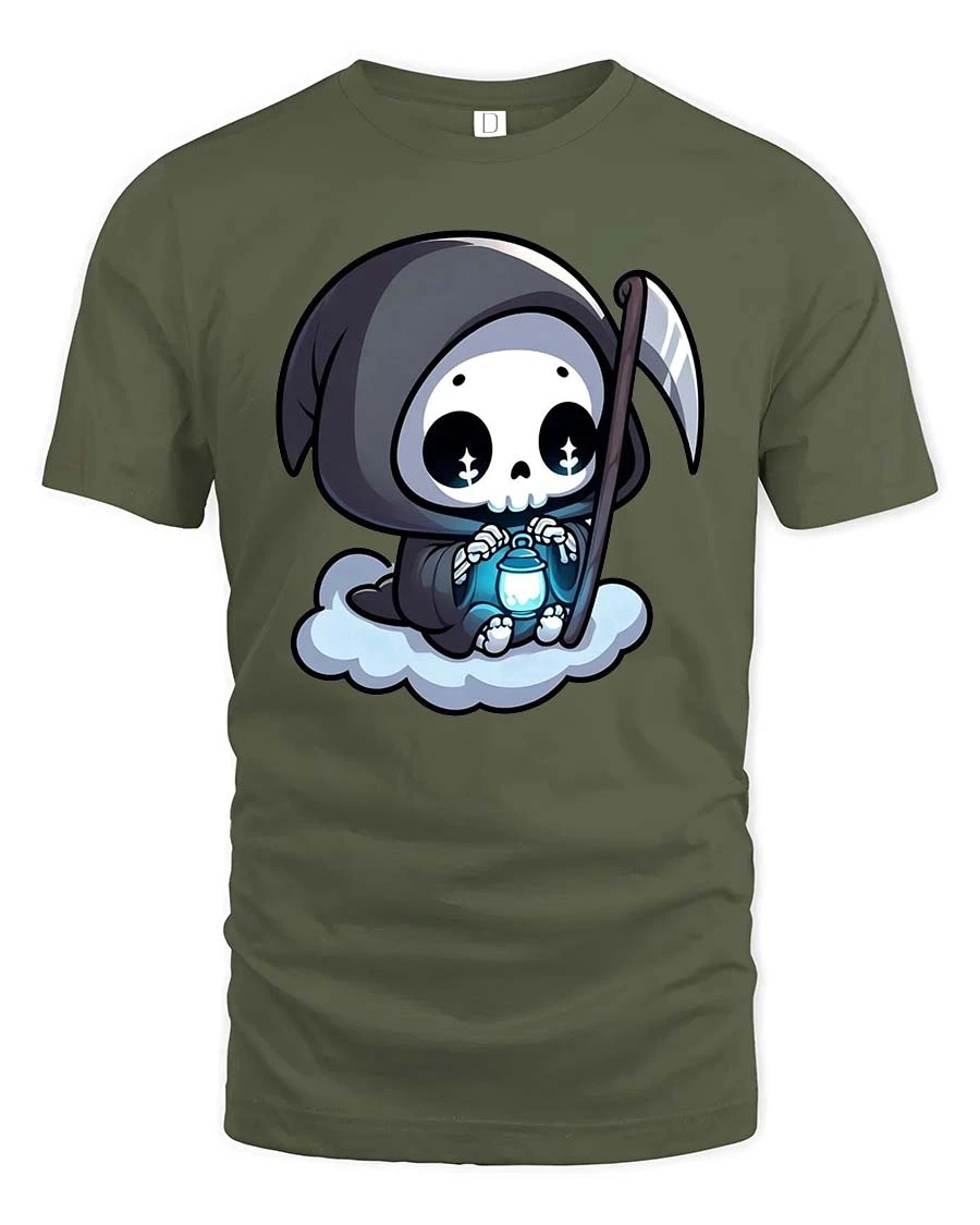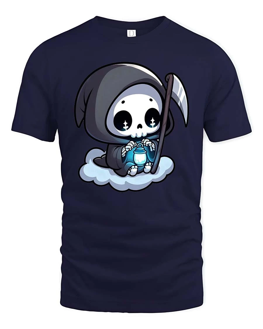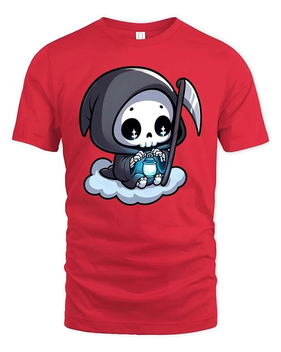 Cute Grim Reaper Cartoon Lantern Cloud Funny Goth Tshirt features an adorable dark character design that blends spooky charm with playful personality.