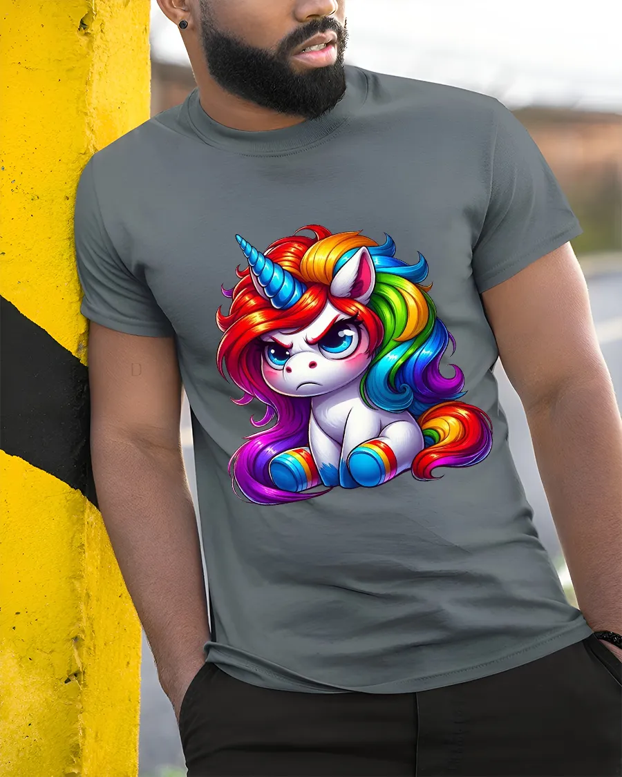 The Cute Grumpy Rainbow Unicorn Graphic Tee Colorful Fantasy Tshirt brings humor charm and vibrant color together in one eye catching design.