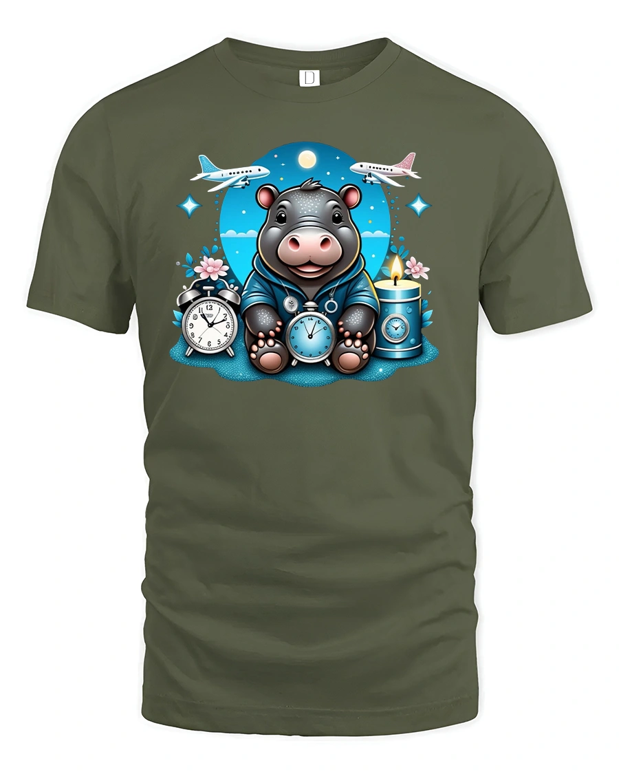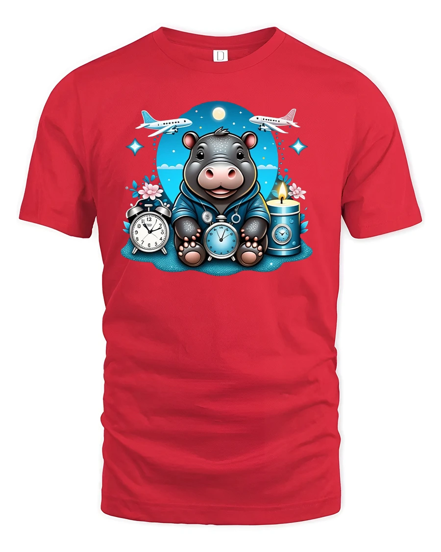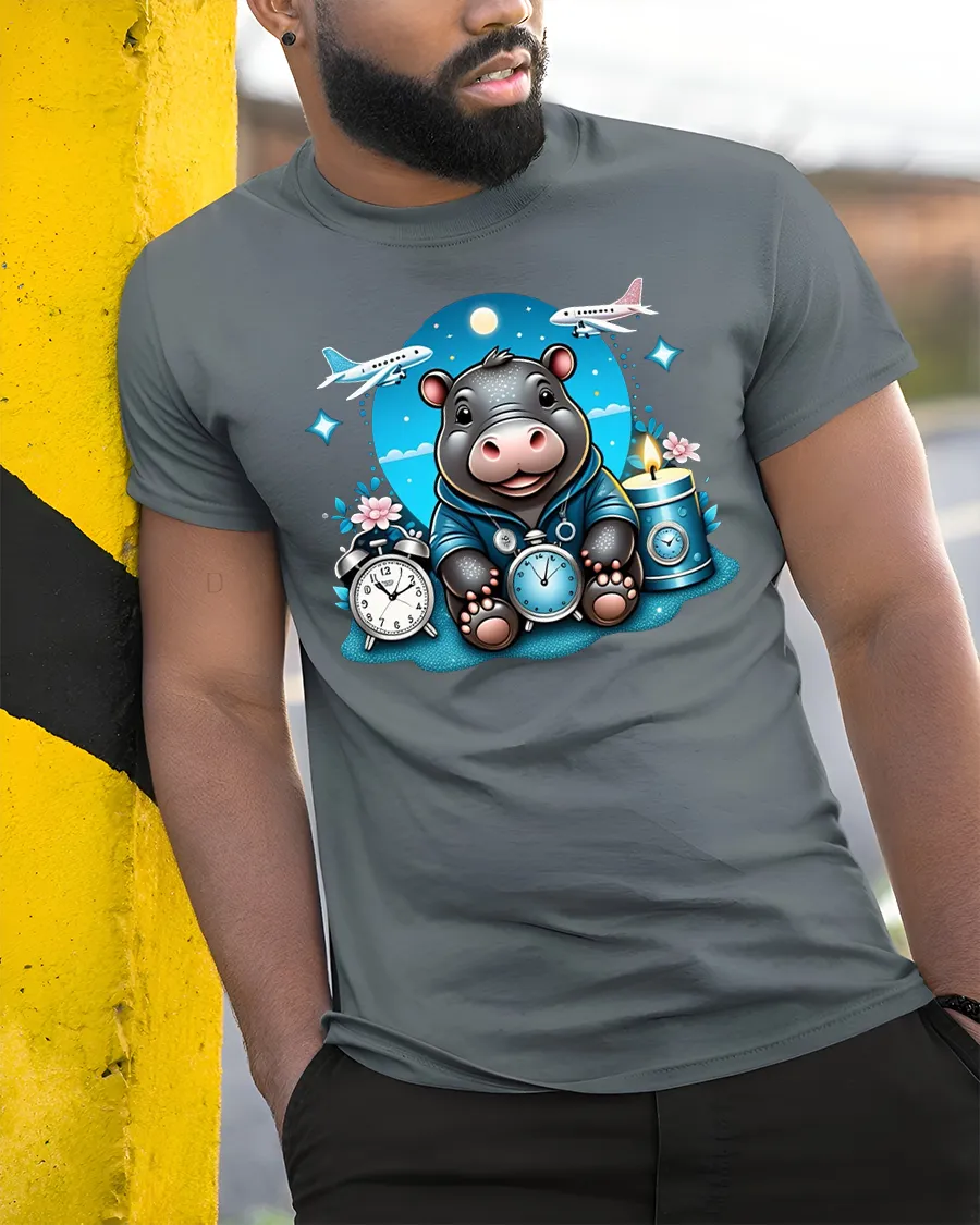 Featuring a happy hippo surrounded by clocks, planes, and stars, this tee captures the spirit of adventure and curiosity.