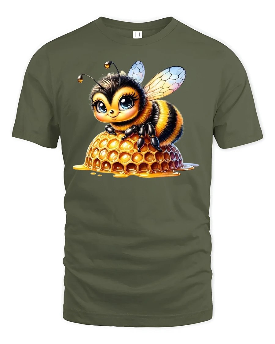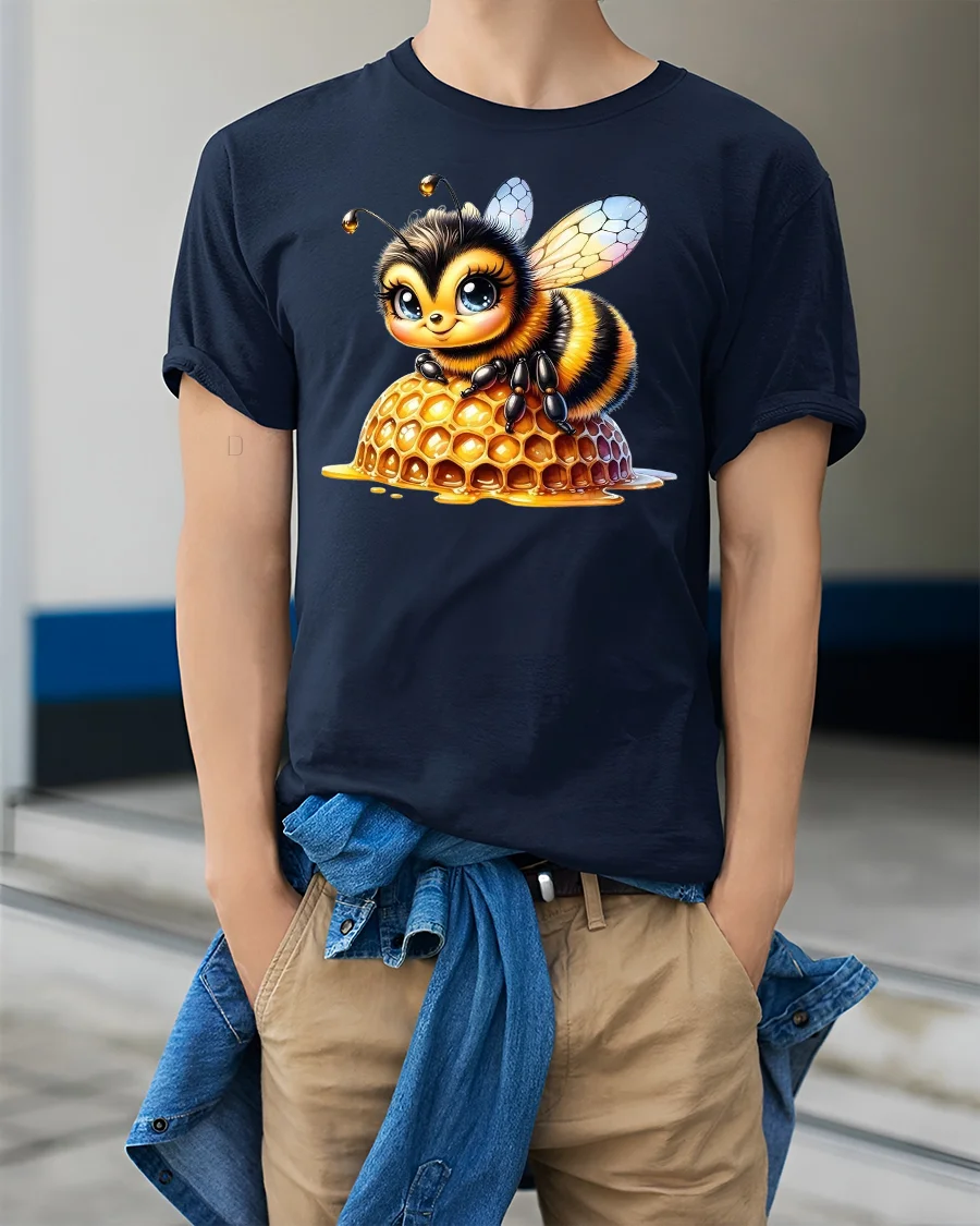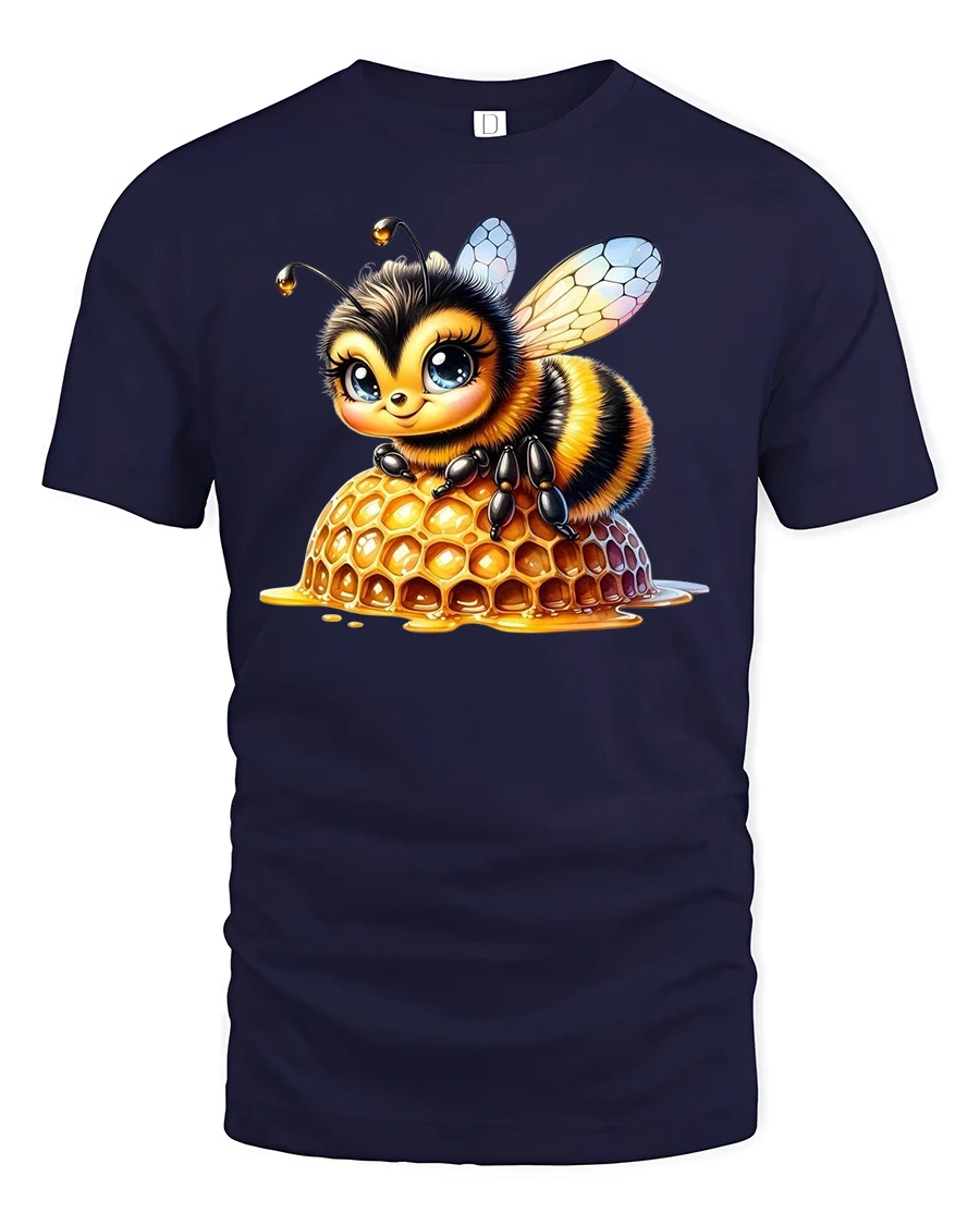 Bring sweetness and joy to your day with this Cute Honey Bee Sitting on Honeycomb Graphic T-Shirt, featuring an irresistibly adorable bee perched on a dripping golden honeycomb.