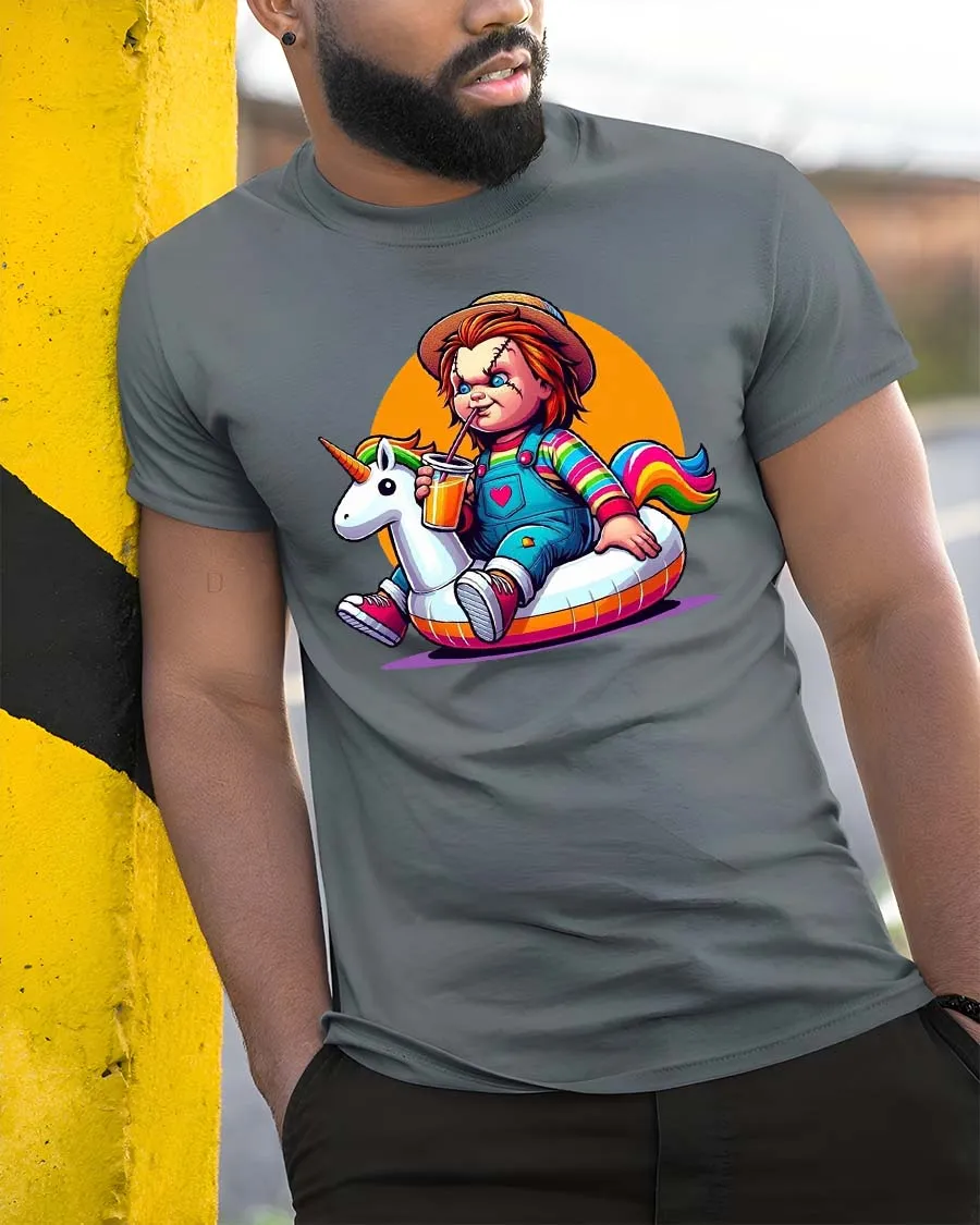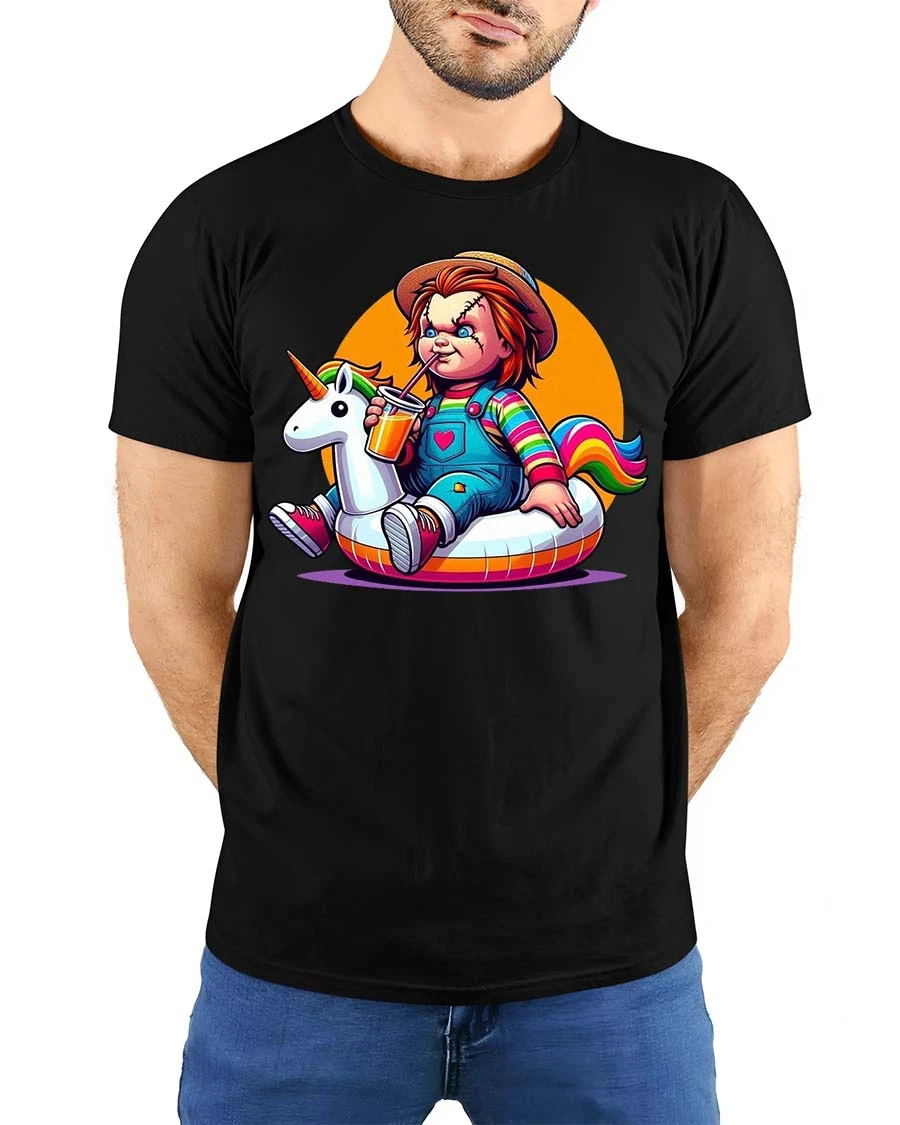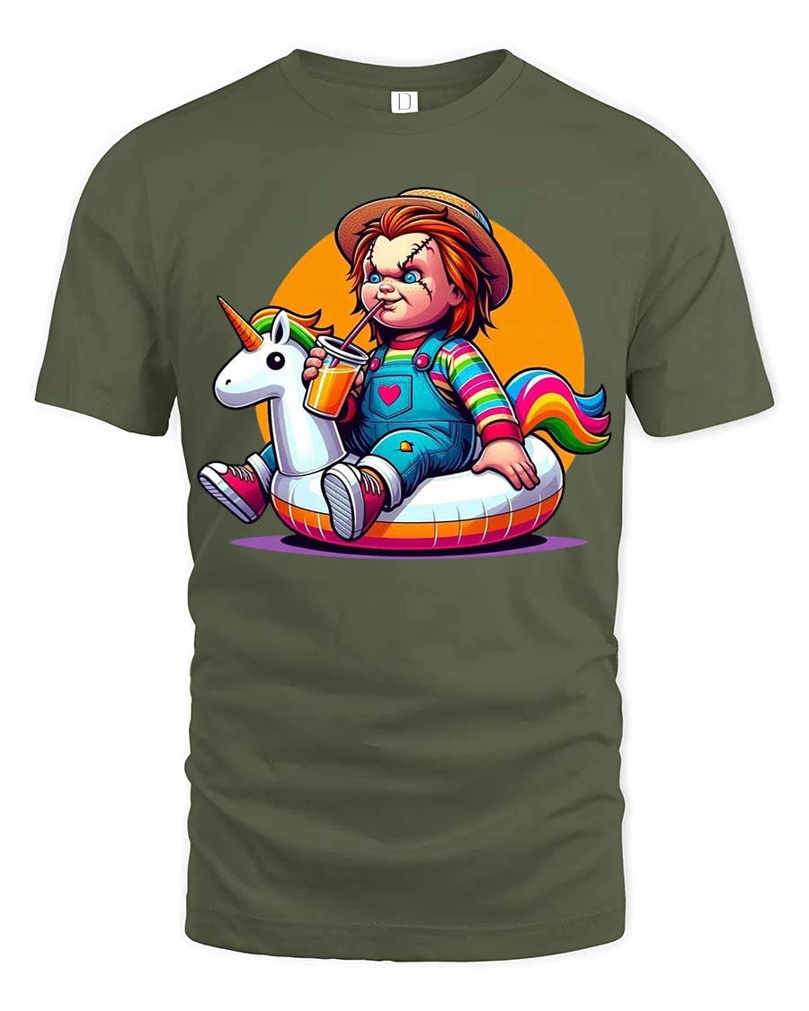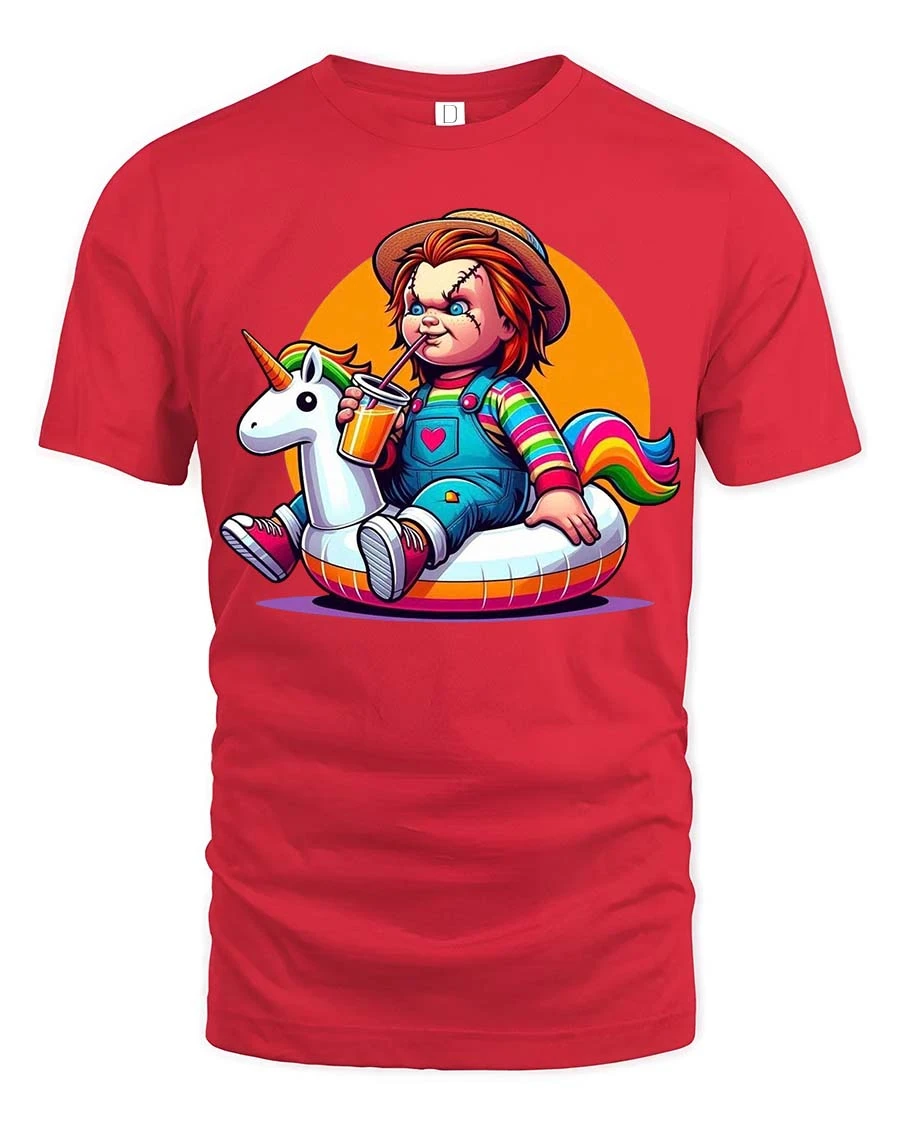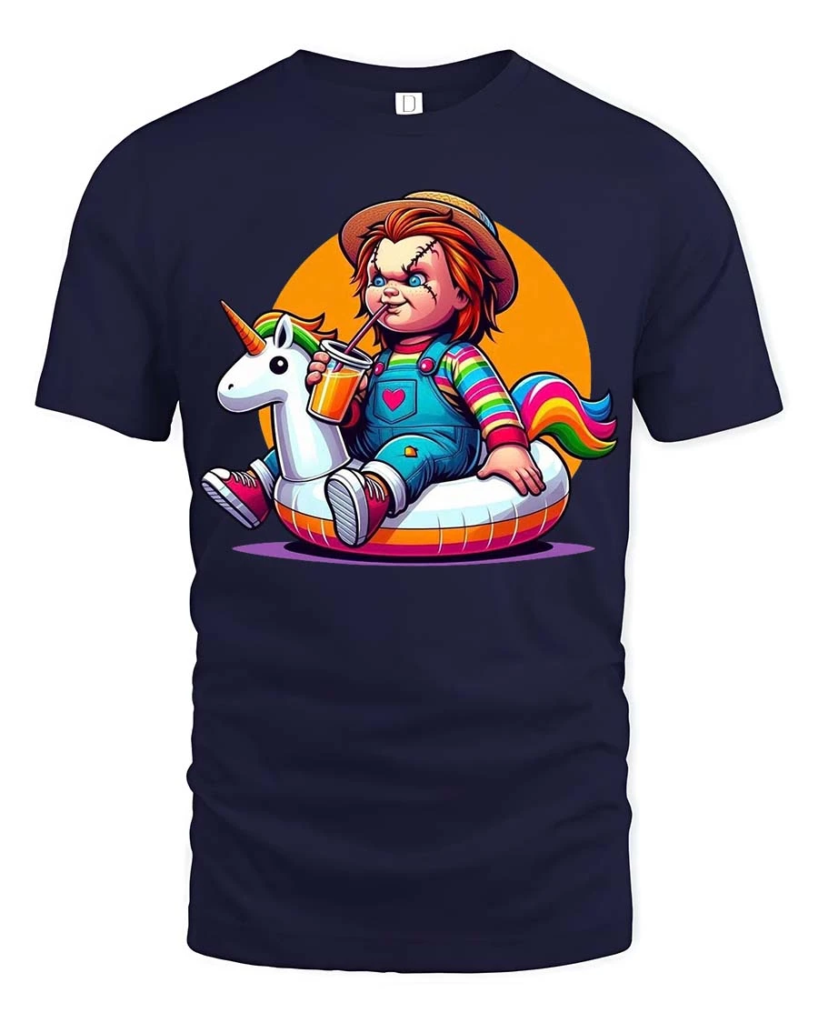 The Cute Horror Doll Unicorn Float T-Shirt combines dark humor with playful cartoon style to create a bold and eye-catching graphic tee. Featuring a mischievous horror doll character relaxing on a colorful unicorn float, the design blends spooky aesthetics with bright, cheerful elements for a fun and unexpected twist. This unique contrast makes the shirt perfect for fans of horror culture who also appreciate quirky, humorous artwork.